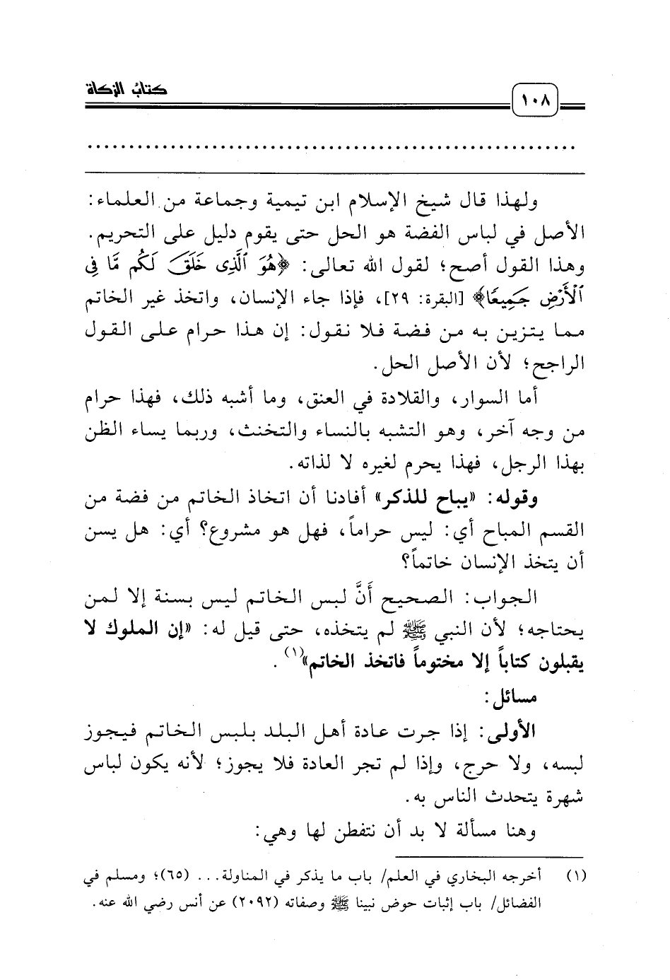 ولهذا قال شيخ الإسلام ابن تيمية وجماعة من العلماء: الأصل في لباس الفضة هو الحل حتى يقوم دليل على التحريم. وهذا القول أصح؛ لقول الله تعالى: {هُوَ الَّذِي خَلَقَ لَكُمْ مَا فِي الأَرْضِ جَمِيعًا} [البقرة: 29]، فإذا جاء الإنسان، واتخذ غير الخاتم مما يتزين به من فضة فلا نقول: إن هذا حرام على القول الراجح؛ لأن الأصل الحل.
