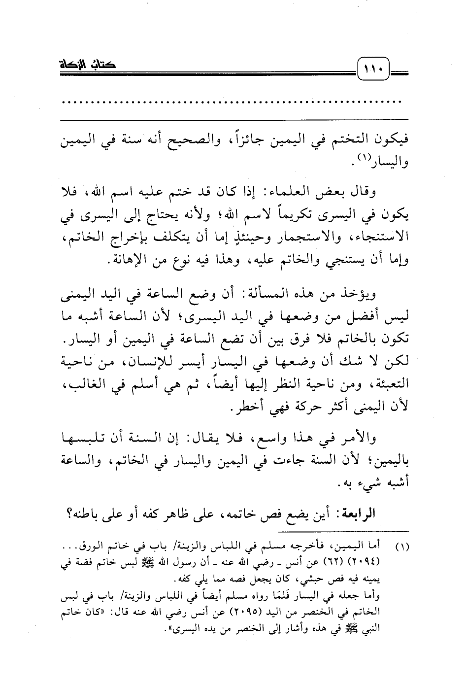 ويؤخذ من هذه المسألة: أن وضع الساعة في اليد اليمنى ليس أفضل من وضعها في اليد اليسرى؛ لأن الساعة أشبه ما تكون بالخاتم فلا فرق بين أن تضع الساعة في اليمين أو اليسار. لكن لا شك أن وضعها في اليسار أيسر للإنسان، من ناحية التعبئة، ومن ناحية النظر إليها أيضاً، ثم هي أسلم في الغالب، لأن اليمنى أكثر حركة فهي أخطر.