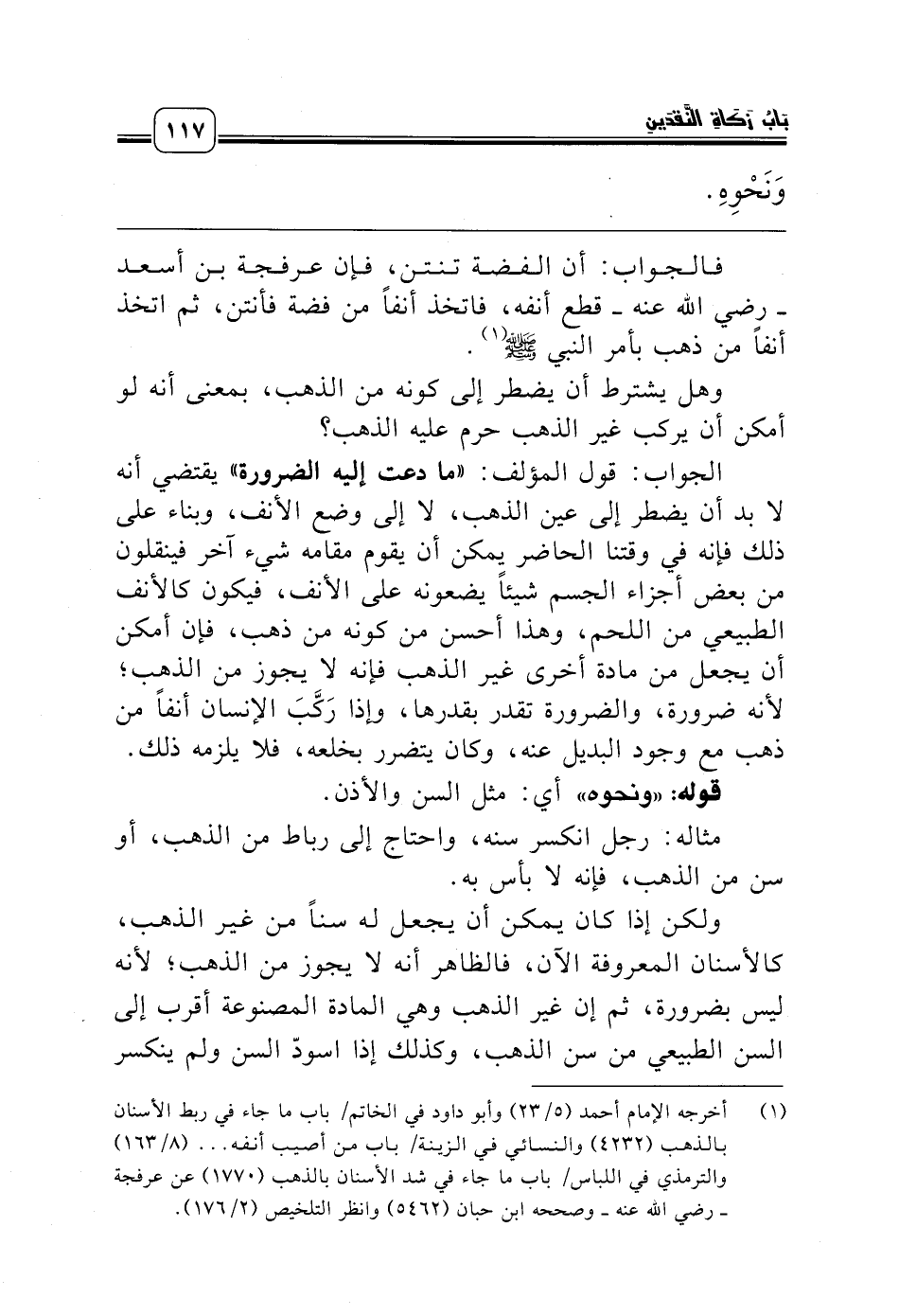 (¬1) أخرجه الإمام أحمد (5/ 23) وأبو داود في الخاتم/ باب ما جاء في ربط الأسنان بالذهب (4232) والنسائي في الزينة/ باب من أصيب أنفه ... (8/ 163) والترمذي في اللباس/ باب ما جاء في شد الأسنان بالذهب (1770) عن عرفجة ـ رضي الله عنه ـ وصححه ابن حبان (5462) وانظر التلخيص (2/ 176).
