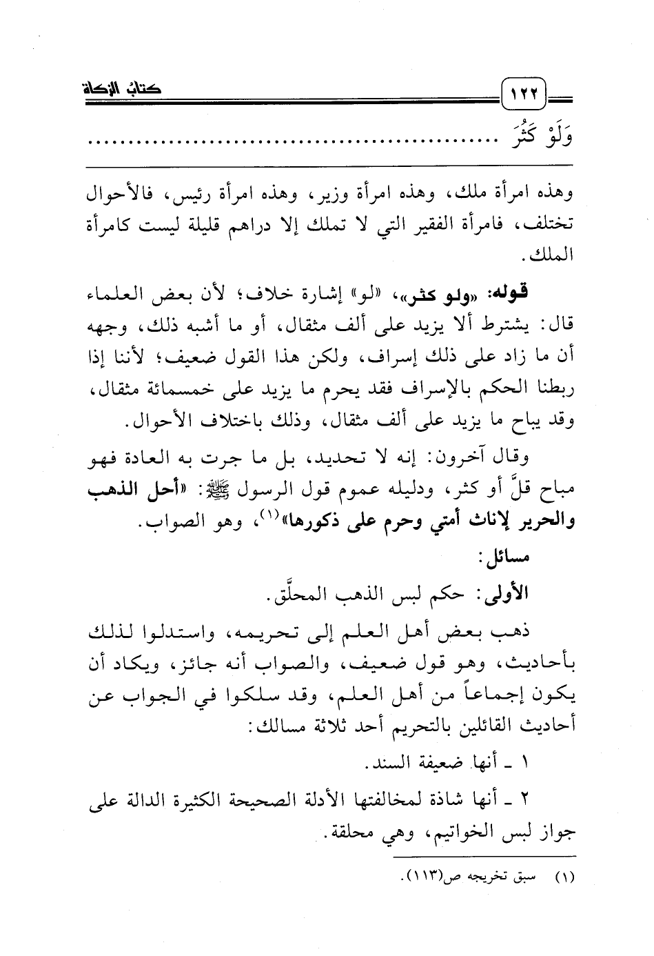 وقال آخرون: إنه لا تحديد، بل ما جرت به العادة فهو مباح قلَّ أو كثر، ودليله عموم قول الرسول صلّى الله عليه وسلّم: «أحل الذهب والحرير لإناث أمتي وحرم على ذكورها» (¬1)، وهو الصواب.