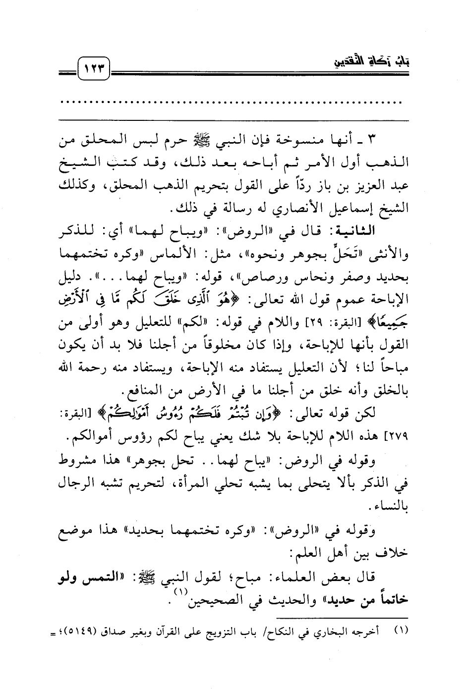 الثانية: قال في «الروض»: «ويباح لهما» أي: للذكر والأنثى «تَحَلٍّ بجوهر ونحوه»، مثل: الألماس «وكره تختمهما بحديد وصفر ونحاس ورصاص»، قوله: «ويباح لهما ... ». دليل الإباحة عموم قول الله تعالى: {هُوَ الَّذِي خَلَقَ لَكُمْ مَا فِي الأَرْضِ جَمِيعًا} [البقرة: 29] واللام في قوله: «لكم» للتعليل وهو أولى من القول بأنها للإباحة، وإذا كان مخلوقاً من أجلنا فلا بد أن يكون مباحاً لنا؛ لأن التعليل يستفاد منه الإباحة، ويستفاد منه رحمة الله بالخلق وأنه خلق من أجلنا ما في الأرض من المنافع.