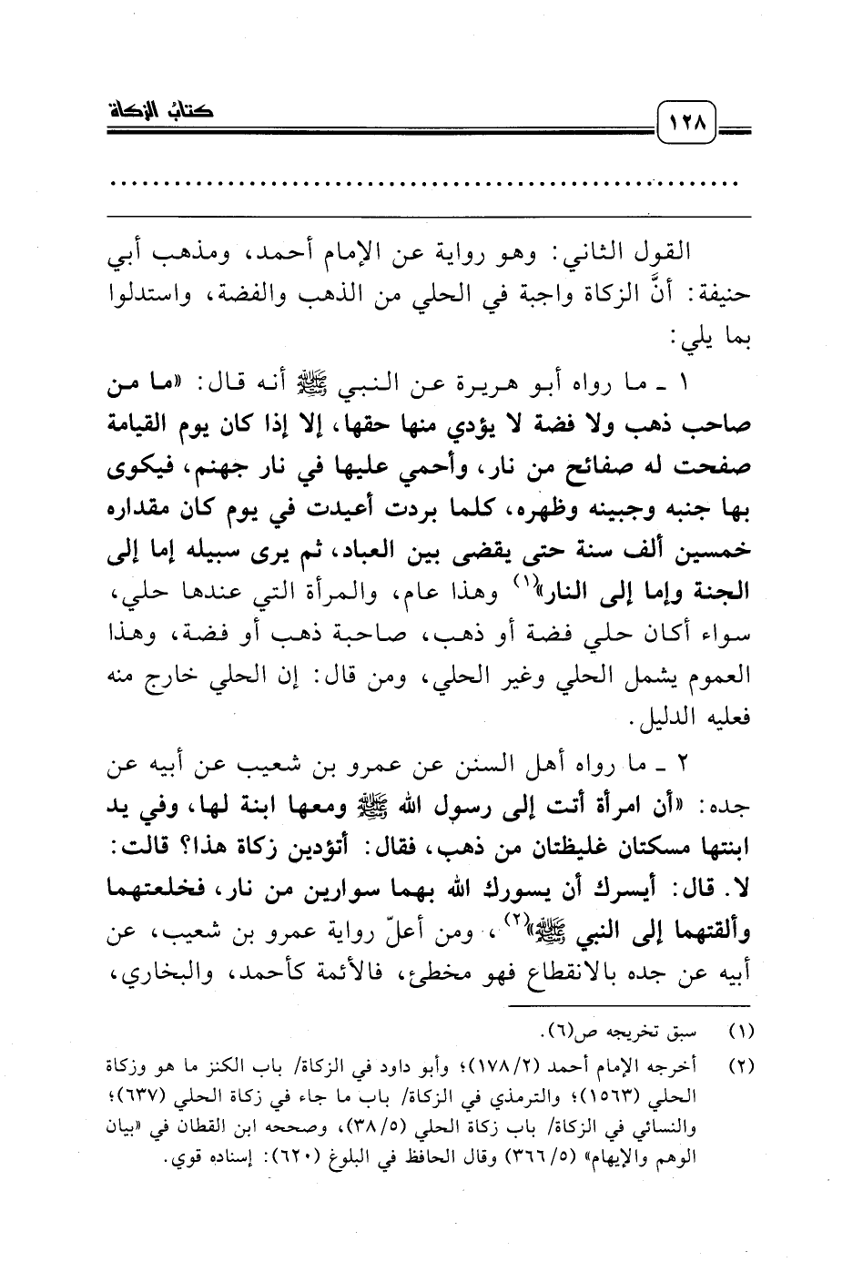 2 ـ ما رواه أهل السنن عن عمرو بن شعيب عن أبيه عن جده: «أن امرأة أتت إلى رسول الله صلّى الله عليه وسلّم ومعها ابنة لها، وفي يد ابنتها مسكتان غليظتان من ذهب، فقال: أتؤدين زكاة هذا؟ قالت: لا. قال: أيسرك أن يسورك الله بهما سوارين من نار، فخلعتهما وألقتهما إلى النبي صلّى الله عليه وسلّم» (¬2)، ومن أعلّ رواية عمرو بن شعيب، عن أبيه عن جده بالانقطاع فهو مخطئ، فالأئمة كأحمد، والبخاري،