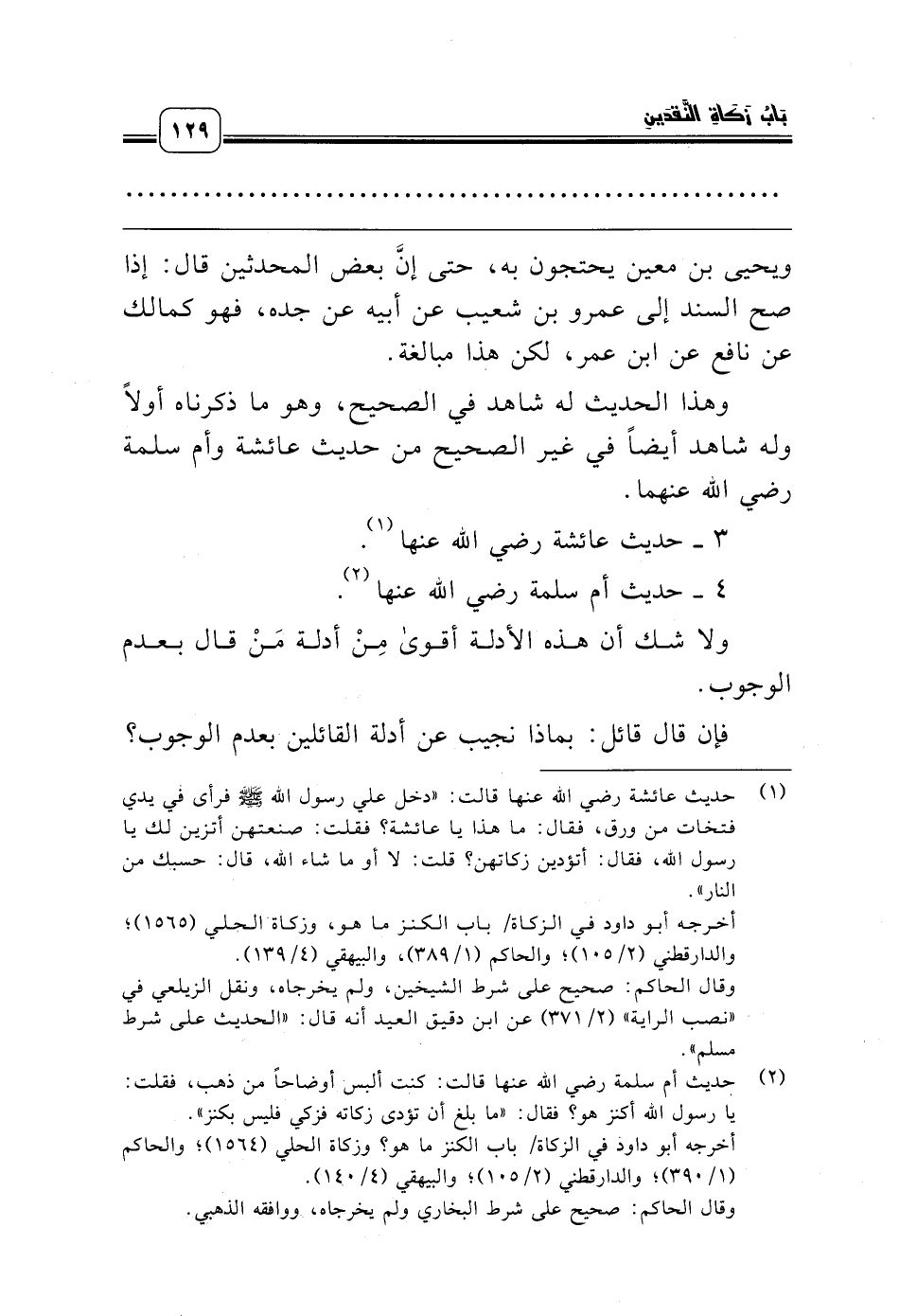 (¬1) حديث عائشة رضي الله عنها قالت: «دخل علي رسول الله صلّى الله عليه وسلّم فرأى في يدي فتخات من ورق، فقال: ما هذا يا عائشة؟ فقلت: صنعتهن أتزين لك يا رسول الله، فقال: أتؤدين زكاتهن؟ قلت: لا أو ما شاء الله، قال: حسبك من النار».