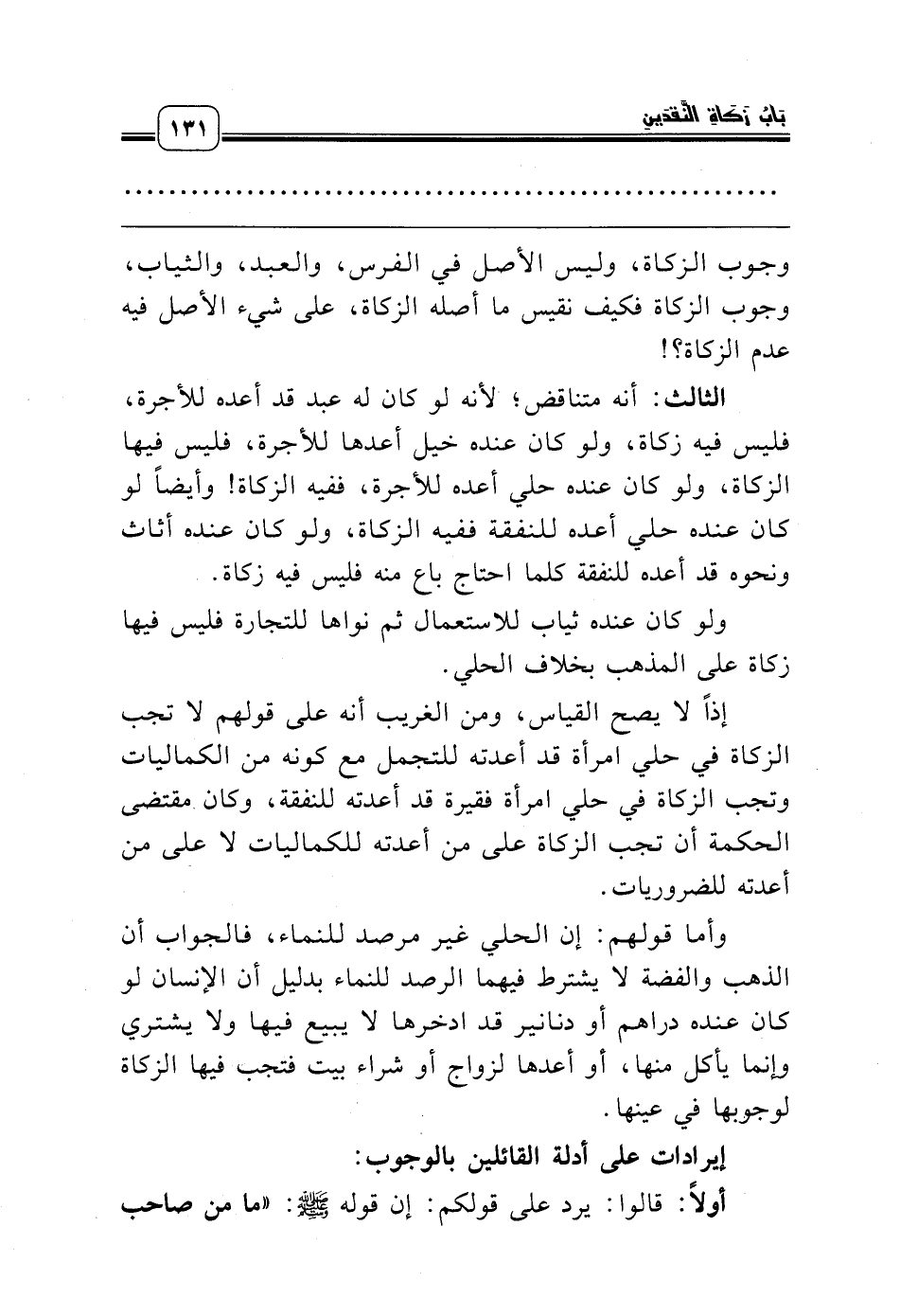 الثالث: أنه متناقض؛ لأنه لو كان له عبد قد أعده للأجرة، فليس فيه زكاة، ولو كان عنده خيل أعدها للأجرة، فليس فيها الزكاة، ولو كان عنده حلي أعده للأجرة، ففيه الزكاة! وأيضاً لو كان عنده حلي أعده للنفقة ففيه الزكاة، ولو كان عنده أثاث ونحوه قد أعده للنفقة كلما احتاج باع منه فليس فيه زكاة.