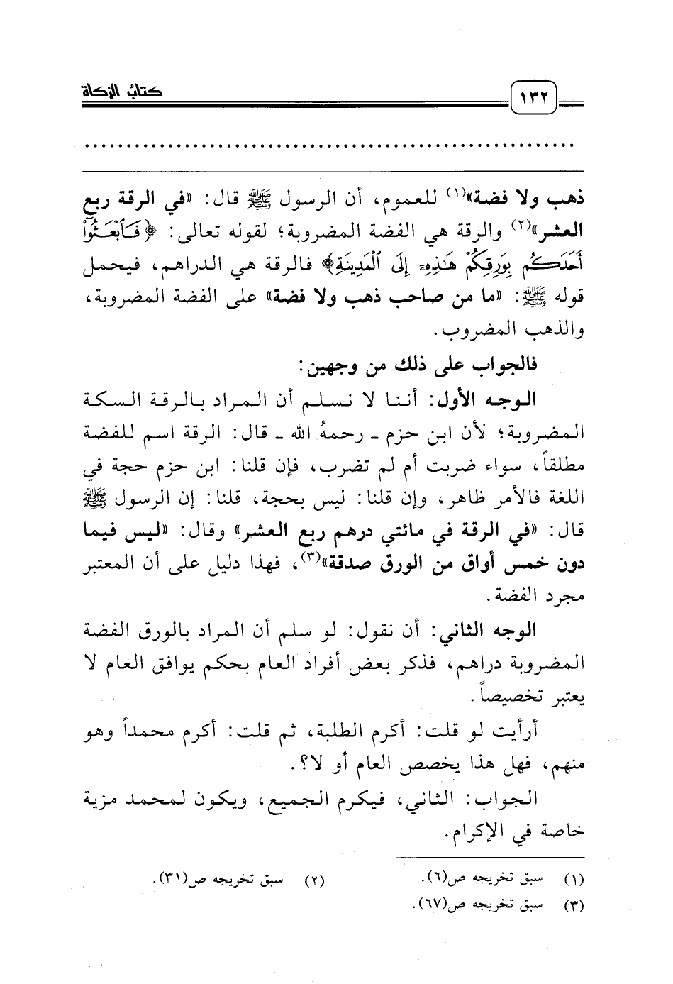 ذهب ولا فضة» (¬1) للعموم، أن الرسول صلّى الله عليه وسلّم قال: «في الرقة ربع العشر» (¬2) والرقة هي الفضة المضروبة؛ لقوله تعالى: {فَابْعَثُوا أَحَدَكُمْ بِوَرِقِكُمْ هَذِهِ إِلَى الْمَدِينَةِ} فالرقة هي الدراهم، فيحمل قوله صلّى الله عليه وسلّم: «ما من صاحب ذهب ولا فضة» على الفضة المضروبة، والذهب المضروب.
