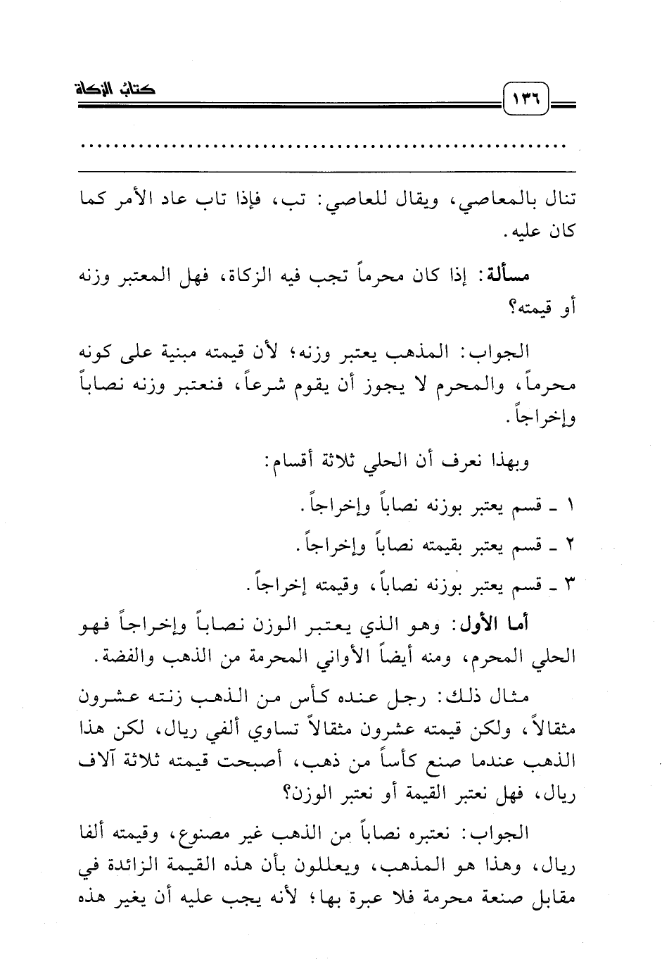 مسألة: إذا كان محرماً تجب فيه الزكاة، فهل المعتبر وزنه أو قيمته؟