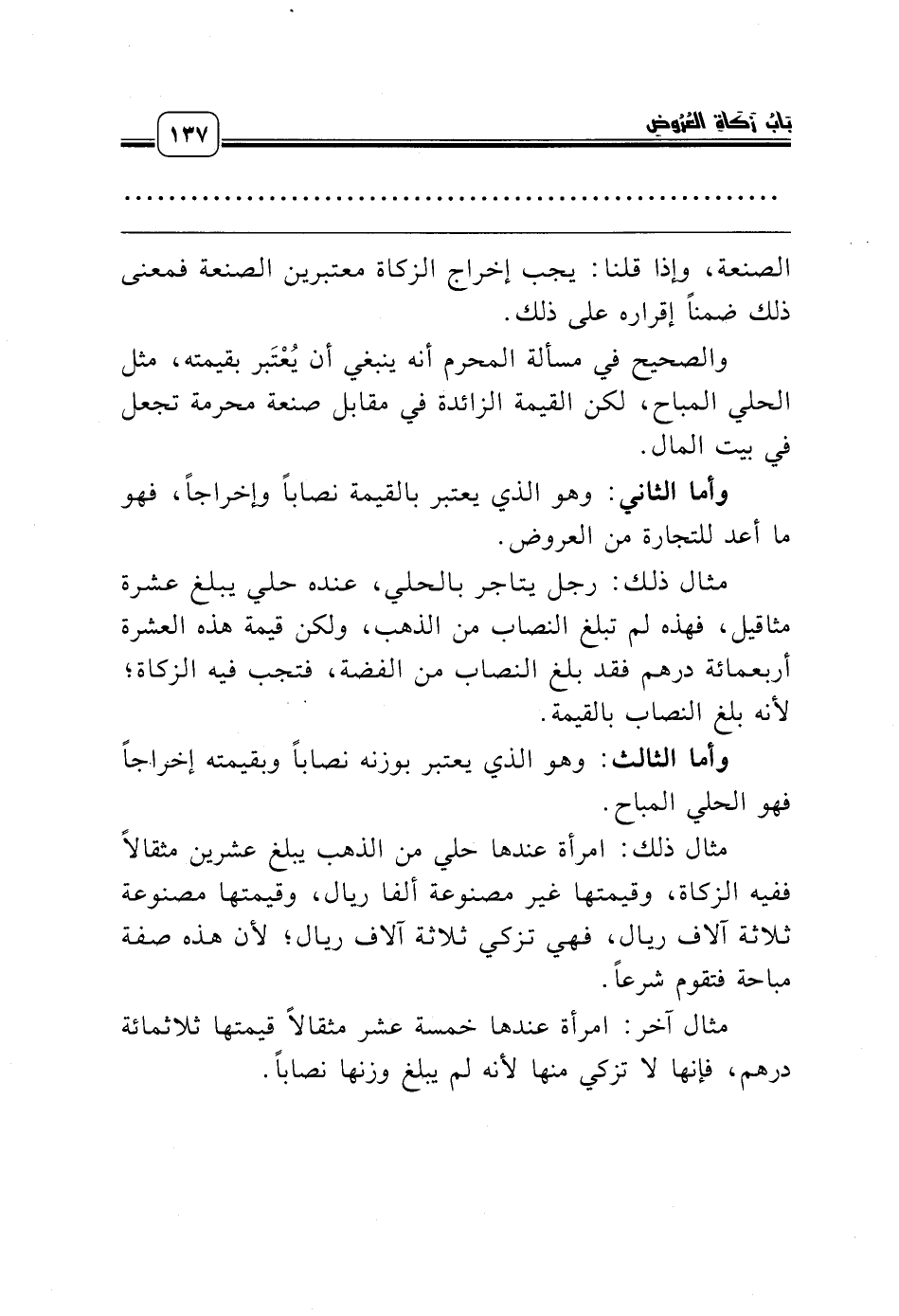 مثال آخر: امرأة عندها خمسة عشر مثقالاً قيمتها ثلاثمائة درهم، فإنها لا تزكي منها لأنه لم يبلغ وزنها نصاباً.