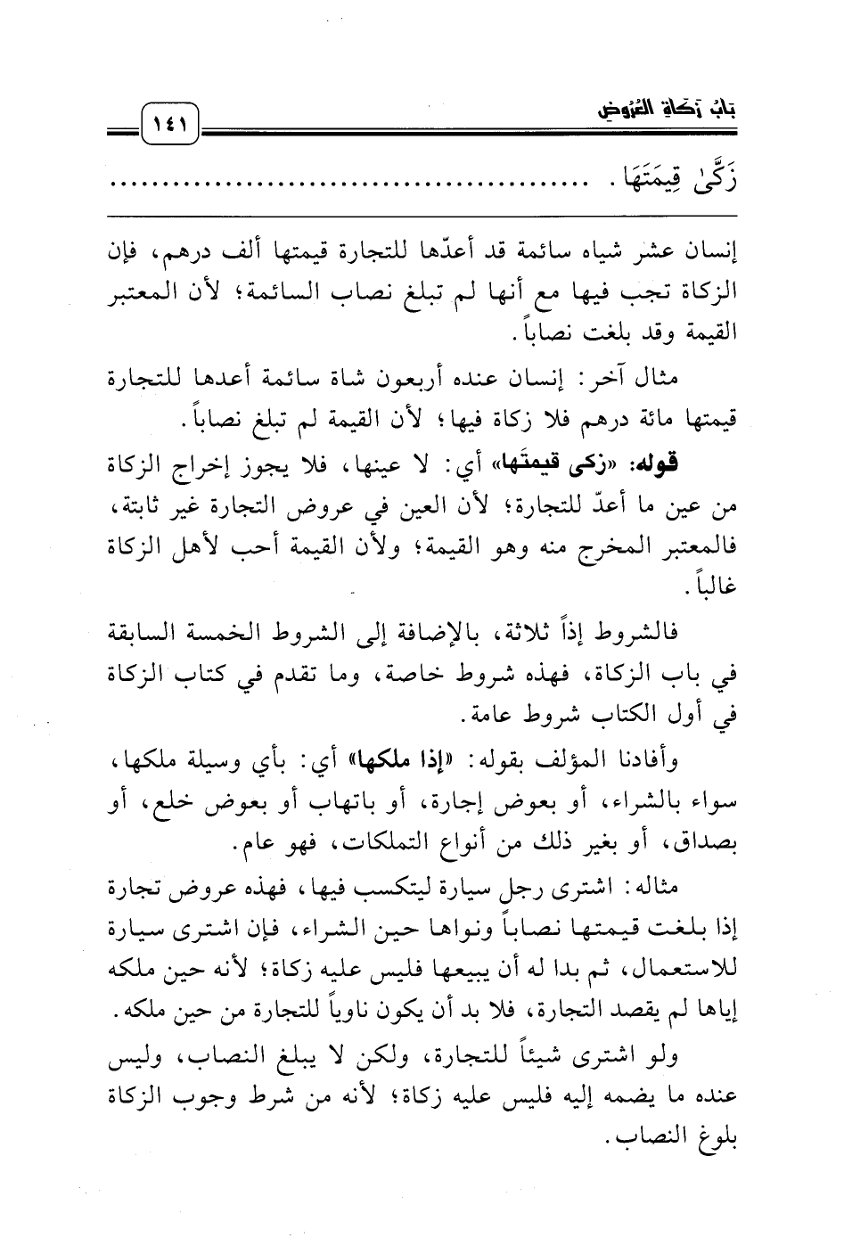 مثال آخر: إنسان عنده أربعون شاة سائمة أعدها للتجارة قيمتها مائة درهم فلا زكاة فيها؛ لأن القيمة لم تبلغ نصاباً.