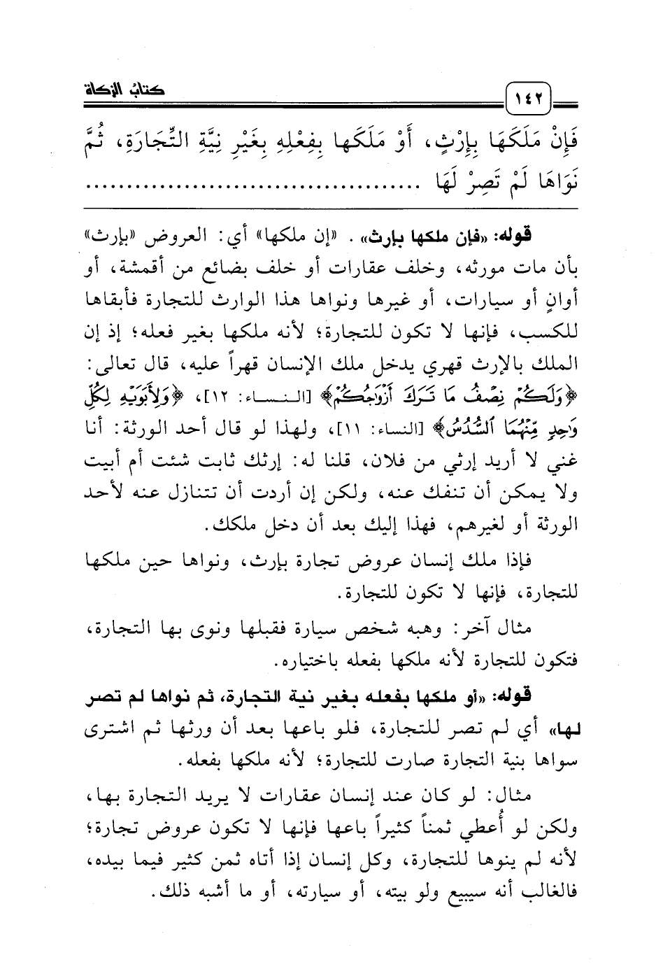 قوله: «فإن ملكها بإرث». «إن ملكها» أي: العروض «بإرث» بأن مات مورثه، وخلف عقارات أو خلف بضائع من أقمشة، أو أوانٍ أو سيارات، أو غيرها ونواها هذا الوارث للتجارة فأبقاها للكسب، فإنها لا تكون للتجارة؛ لأنه ملكها بغير فعله؛ إذ إن الملك بالإرث قهري يدخل ملك الإنسان قهراً عليه، قال تعالى: {وَلَكُمْ نِصْفُ مَا تَرَكَ أَزْوَاجُكُمْ} [النساء: 12]، {وَلأَِبَوَيْهِ لِكُلِّ وَاحِدٍ مِنْهُمَا السُّدُسُ} [النساء: 11]، ولهذا لو قال أحد الورثة: أنا غني لا أريد إرثي من فلان، قلنا له: إرثك ثابت شئت أم أبيت ولا يمكن أن تنفك عنه، ولكن إن أردت أن تتنازل عنه لأحد الورثة أو لغيرهم، فهذا إليك بعد أن دخل ملكك.