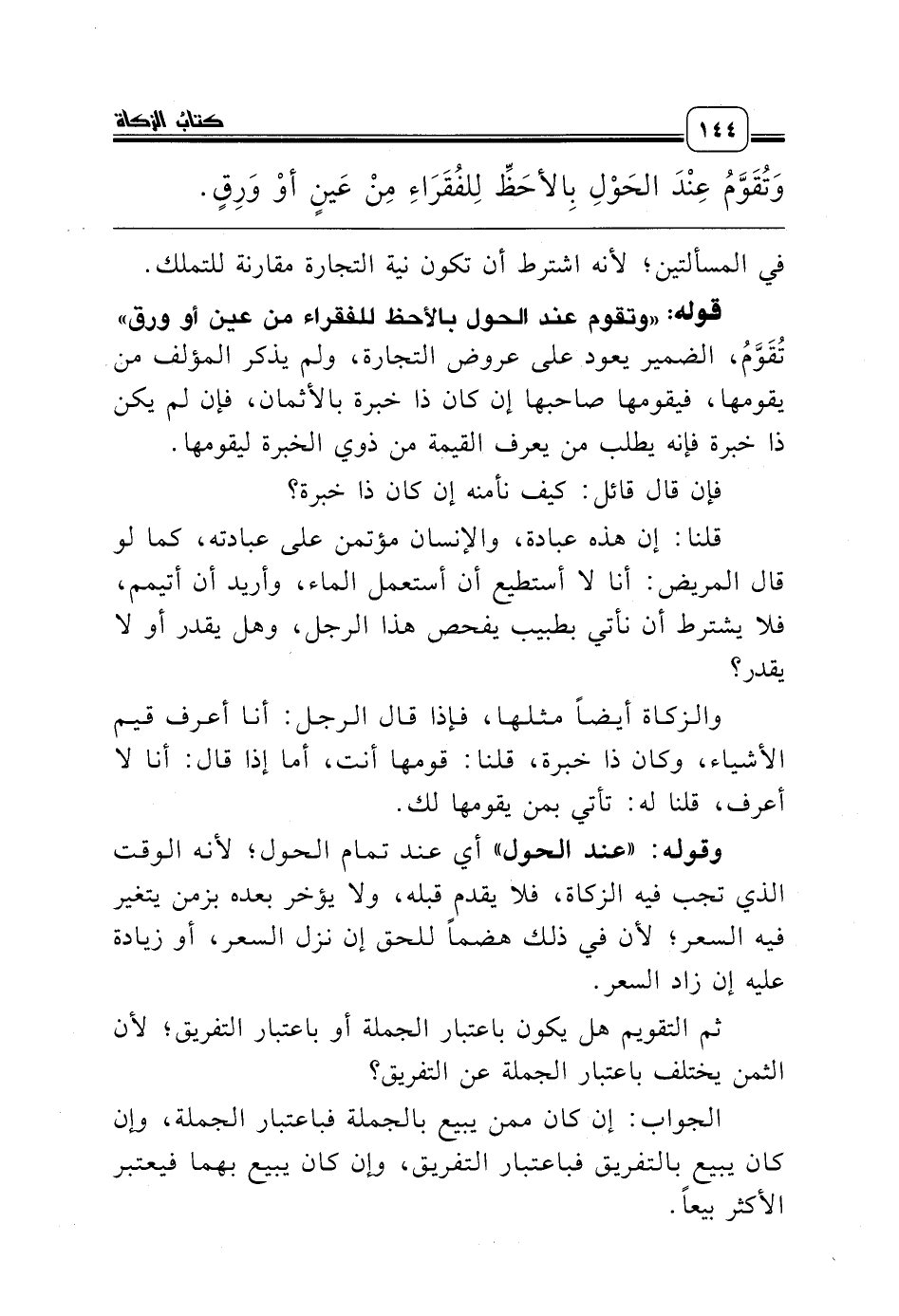 قوله: «وتقوم عند الحول بالأحظ للفقراء من عين أو ورق» تُقَوَّمُ، الضمير يعود على عروض التجارة، ولم يذكر المؤلف من يقومها، فيقومها صاحبها إن كان ذا خبرة بالأثمان، فإن لم يكن ذا خبرة فإنه يطلب من يعرف القيمة من ذوي الخبرة ليقومها.