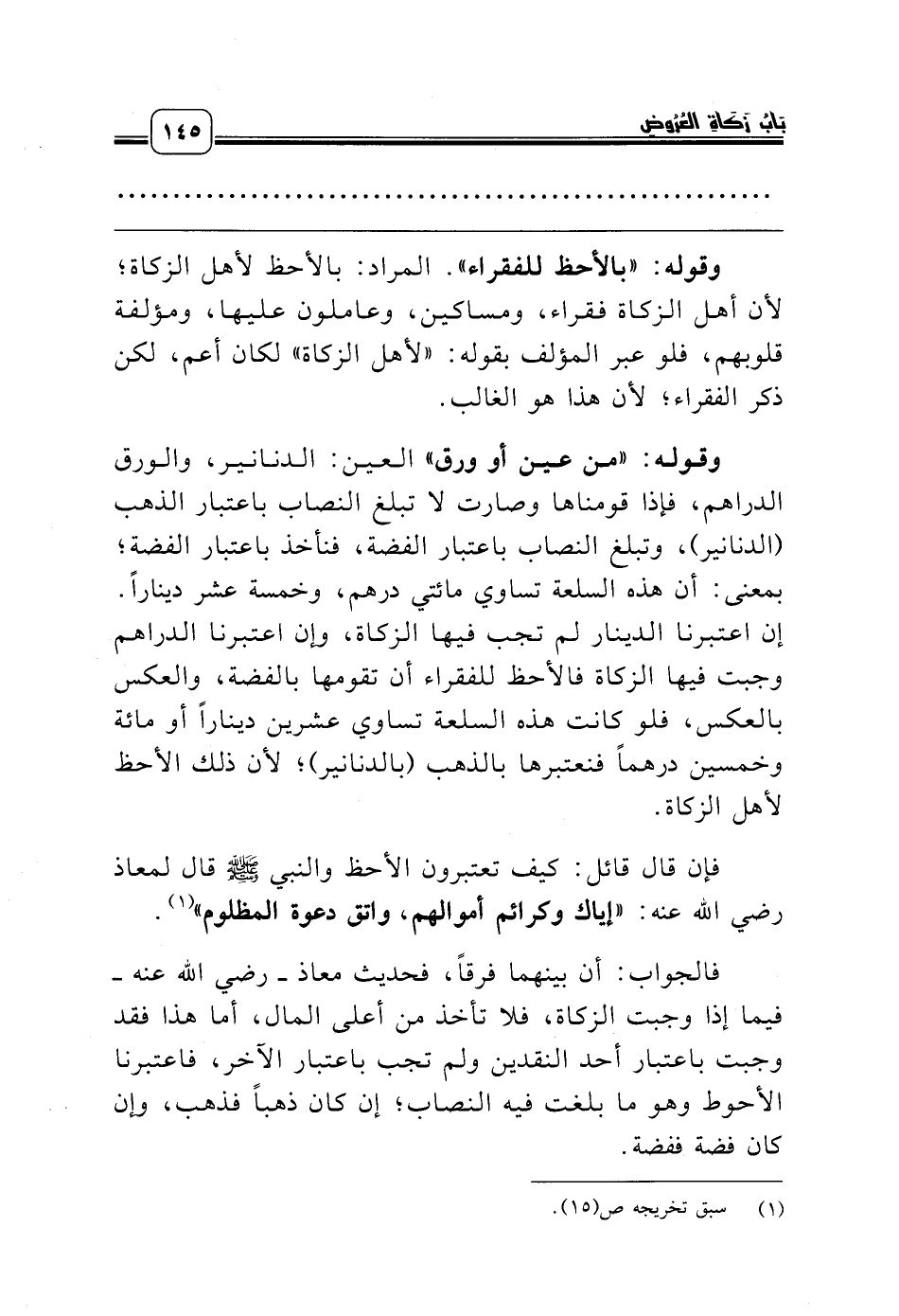 وقوله: «من عين أو ورق» العين: الدنانير، والورق الدراهم، فإذا قومناها وصارت لا تبلغ النصاب باعتبار الذهب (الدنانير)، وتبلغ النصاب باعتبار الفضة، فنأخذ باعتبار الفضة؛ بمعنى: أن هذه السلعة تساوي مائتي درهم، وخمسة عشر ديناراً. إن اعتبرنا الدينار لم تجب فيها الزكاة، وإن اعتبرنا الدراهم وجبت فيها الزكاة فالأحظ للفقراء أن تقومها بالفضة، والعكس بالعكس، فلو كانت هذه السلعة تساوي عشرين ديناراً أو مائة وخمسين درهماً فنعتبرها بالذهب (بالدنانير)؛ لأن ذلك الأحظ لأهل الزكاة.