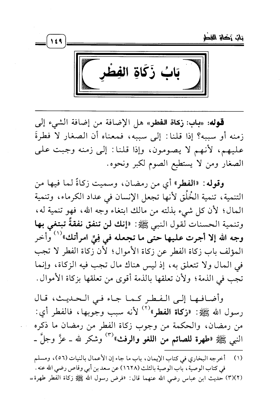 قوله: «باب: زكاة الفطر» هل الإضافة من إضافة الشيء إلى زمنه أو سببه؟ إذا قلنا: إلى سببه، فمعناه أن الصغار لا فطرةَ عليهم، لأنهم لا يصومون، وإذا قلنا: إلى زمنه وجبت على الصغار ومن لا يستطيع الصوم لكبر ونحوه.