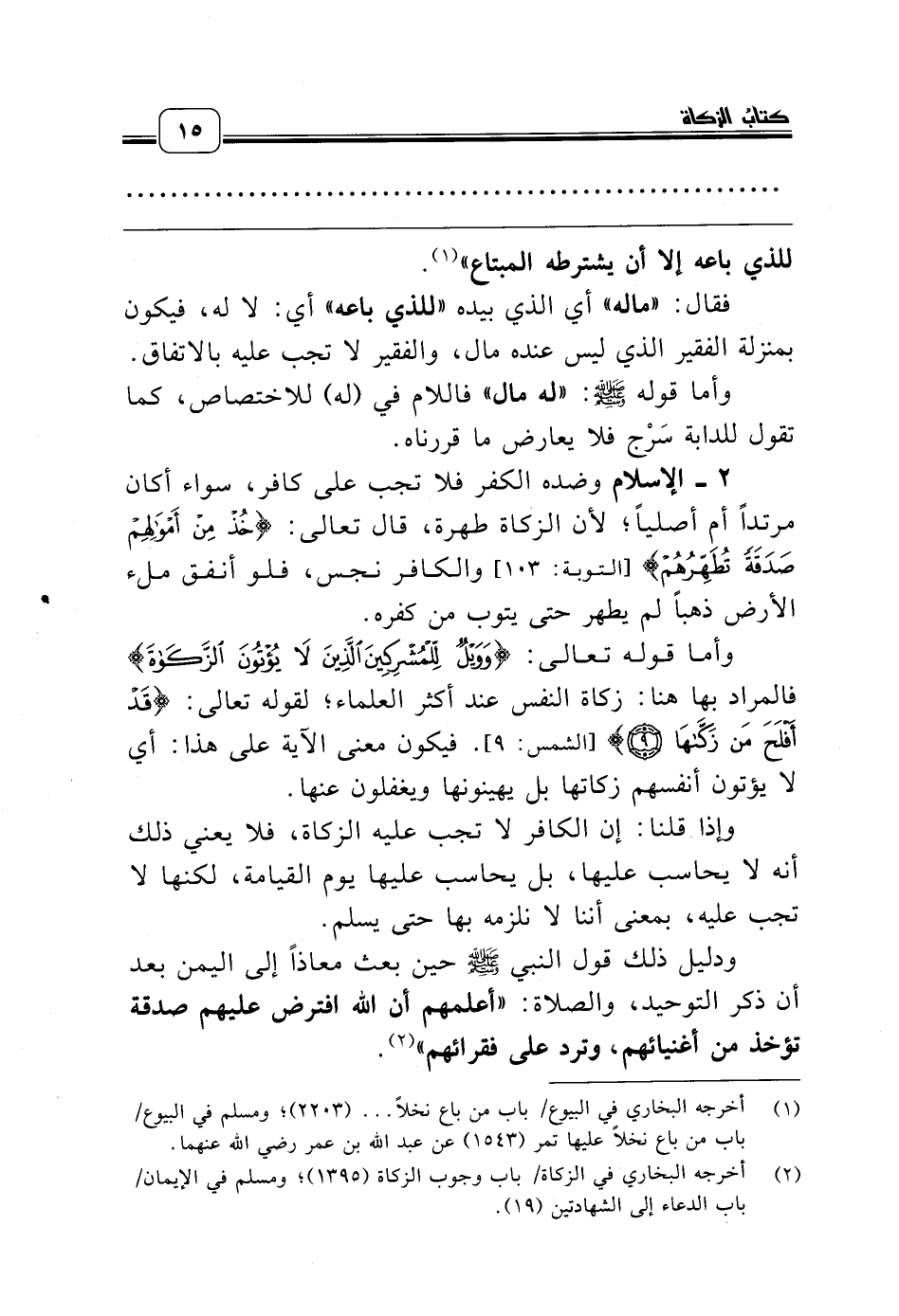 ودليل ذلك قول النبي صلّى الله عليه وسلّم حين بعث معاذاً إلى اليمن بعد أن ذكر التوحيد، والصلاة: «أعلمهم أن الله افترض عليهم صدقة تؤخذ من أغنيائهم، وترد على فقرائهم» (¬2).