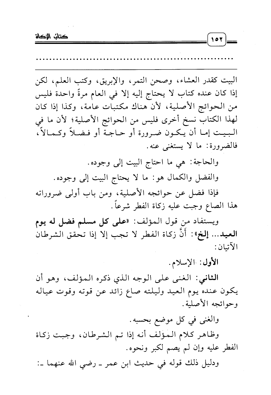 الثاني: الغنى على الوجه الذي ذكره المؤلف، وهو أن يكون عنده يوم العيد وليلته صاع زائد عن قوته وقوت عياله وحوائجه الأصلية.