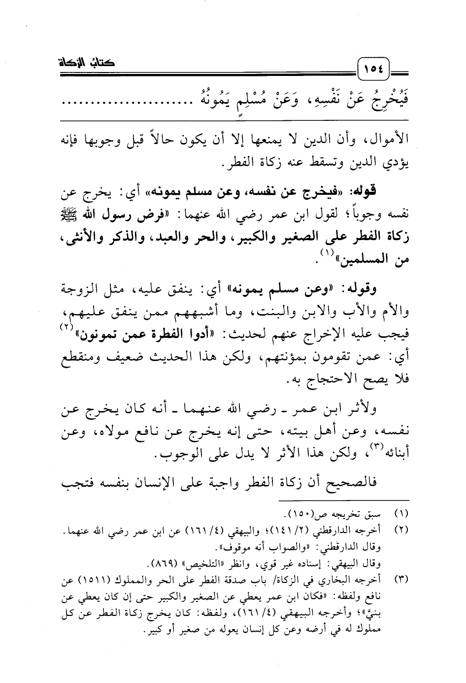 ولأثر ابن عمر ـ رضي الله عنهما ـ أنه كان يخرج عن نفسه، وعن أهل بيته، حتى إنه يخرج عن نافع مولاه، وعن أبنائه (¬3)، ولكن هذا الأثر لا يدل على الوجوب.