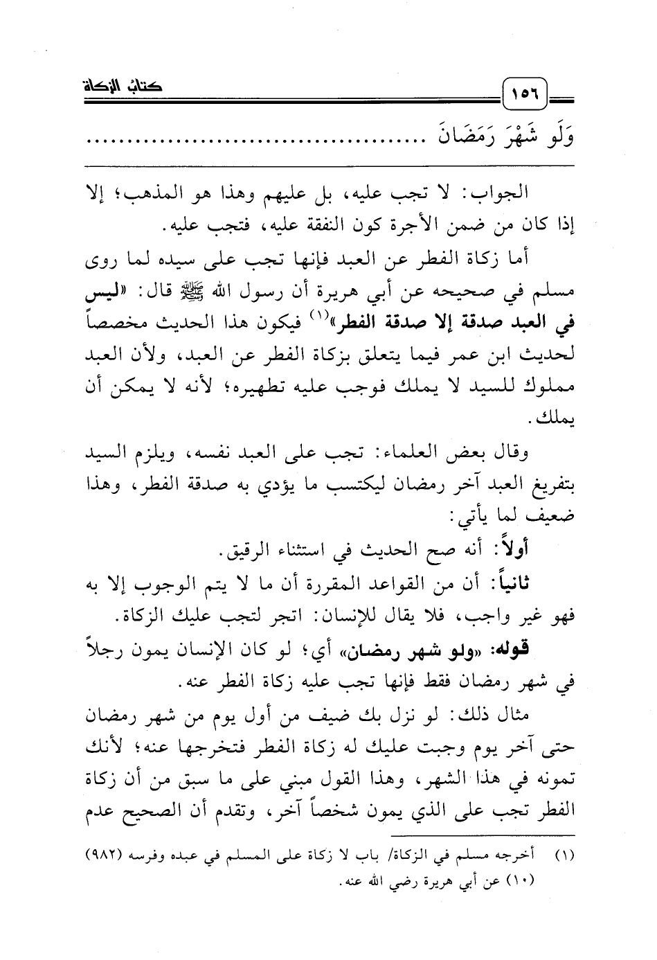 وقال بعض العلماء: تجب على العبد نفسه، ويلزم السيد بتفريغ العبد آخر رمضان ليكتسب ما يؤدي به صدقة الفطر، وهذا ضعيف لما يأتي: