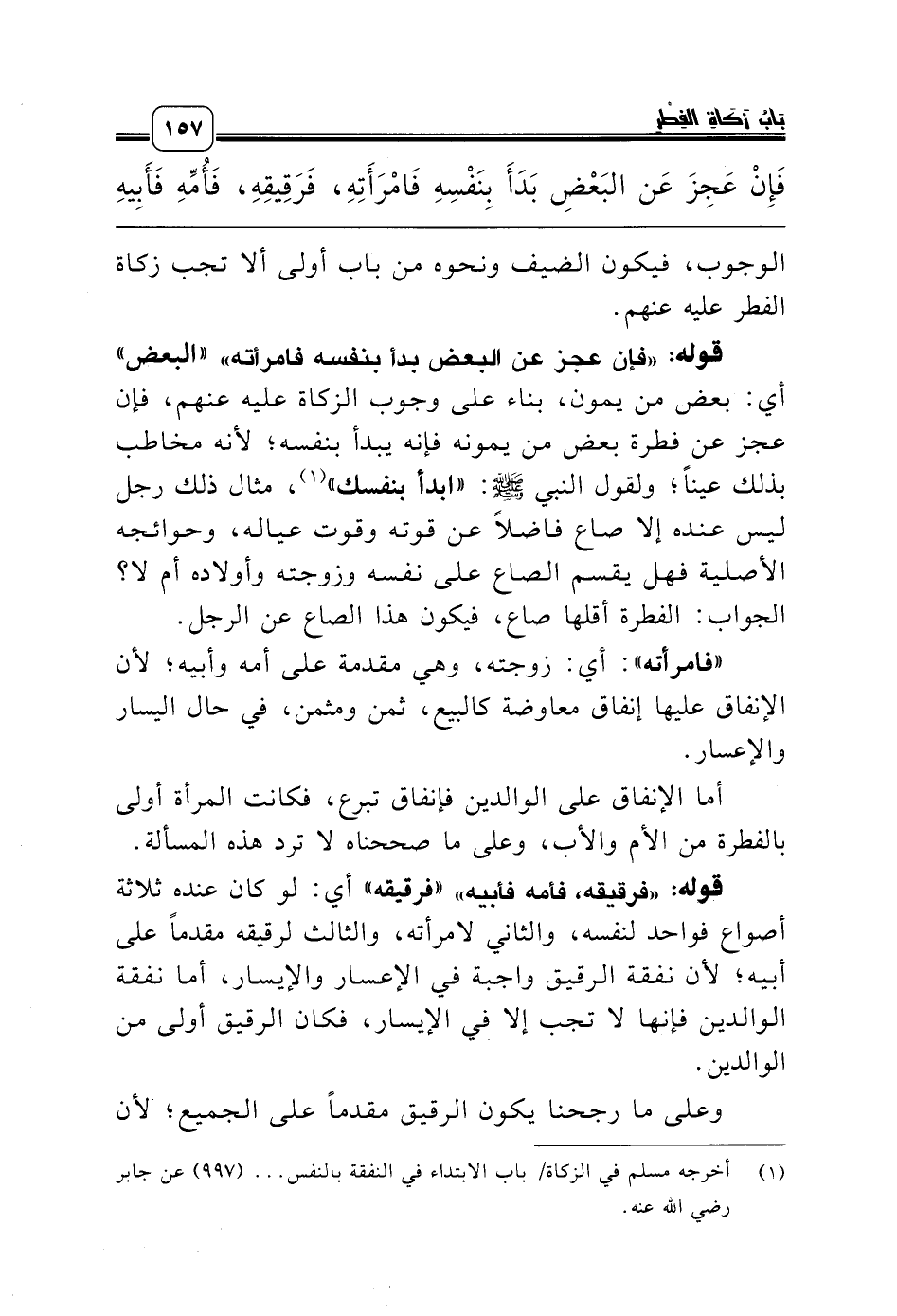 قوله: «فإن عجز عن البعض بدأ بنفسه فامرأته» «البعض» أي: بعض من يمون، بناء على وجوب الزكاة عليه عنهم، فإن عجز عن فطرة بعض من يمونه فإنه يبدأ بنفسه؛ لأنه مخاطب بذلك عيناً؛ ولقول النبي صلّى الله عليه وسلّم: «ابدأ بنفسك» (¬1)، مثال ذلك رجل ليس عنده إلا صاع فاضلاً عن قوته وقوت عياله، وحوائجه الأصلية فهل يقسم الصاع على نفسه وزوجته وأولاده أم لا؟ الجواب: الفطرة أقلها صاع، فيكون هذا الصاع عن الرجل.