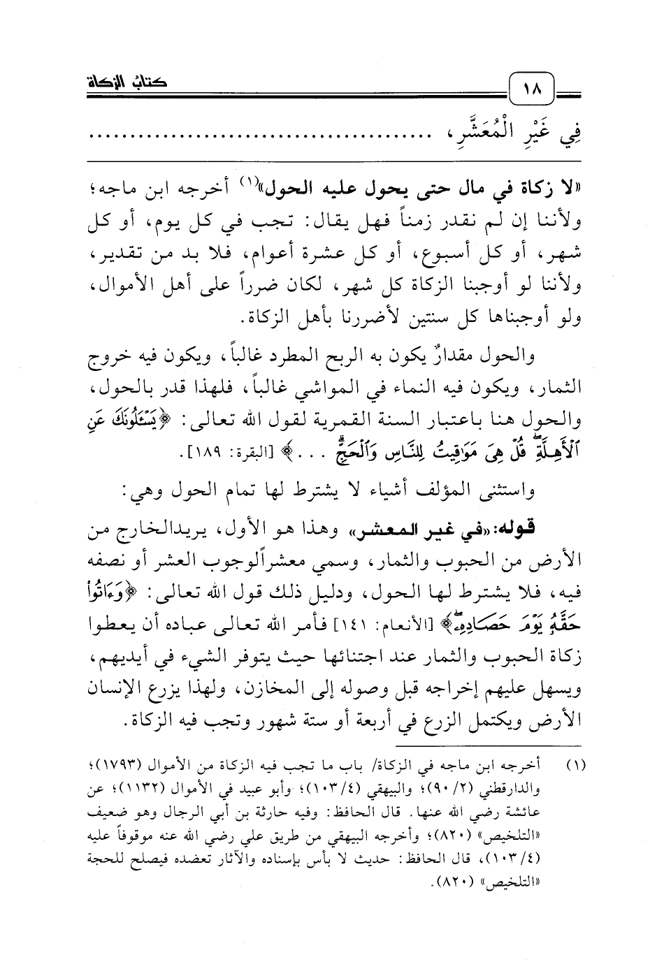 (¬1) أخرجه ابن ماجه في الزكاة/ باب ما تجب فيه الزكاة من الأموال (1793)؛ والدارقطني (2/ 90)؛ والبيهقي (4/ 103)؛ وأبو عبيد في الأموال (1132)؛ عن عائشة رضي الله عنها. قال الحافظ: وفيه حارثة بن أبي الرجال وهو ضعيف «التلخيص» (820)؛ وأخرجه البيهقي من طريق علي رضي الله عنه موقوفاً عليه (4/ 103)، قال الحافظ: حديث لا بأس بإسناده والآثار تعضده فيصلح للحجة «التلخيص» (820).