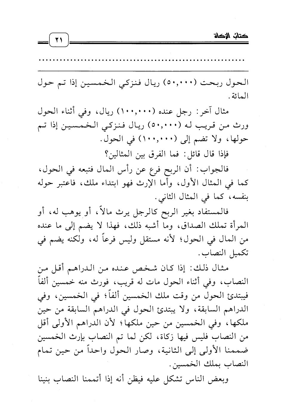 مثال آخر: رجل عنده (100.000) ريال، وفي أثناء الحول ورث من قريب له (50.000) ريال فنزكي الخمسين إذا تم حولها، ولا تضم إلى (100.000) في الحول.