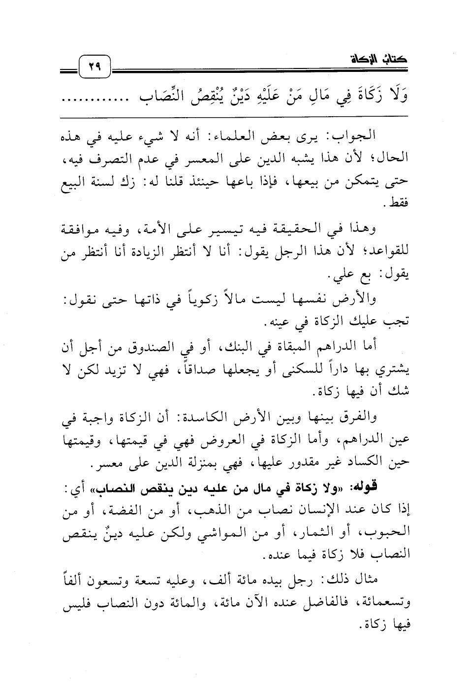 قوله: «ولا زكاة في مال من عليه دين ينقص النصاب» أي: إذا كان عند الإنسان نصاب من الذهب، أو من الفضة، أو من الحبوب، أو الثمار، أو من المواشي ولكن عليه دينٌ ينقص النصاب فلا زكاة فيما عنده.