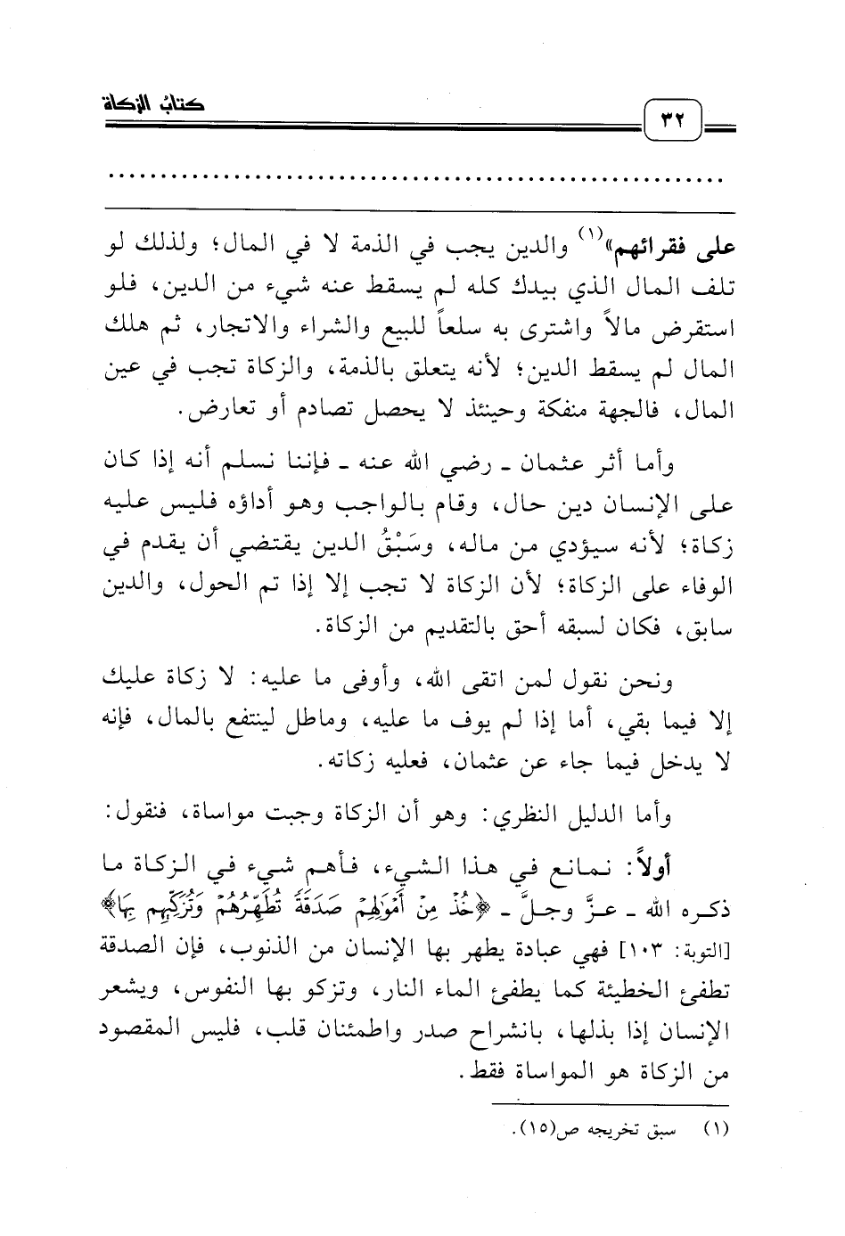 وأما أثر عثمان ـ رضي الله عنه ـ فإننا نسلم أنه إذا كان على الإنسان دين حال، وقام بالواجب وهو أداؤه فليس عليه زكاة؛ لأنه سيؤدي من ماله، وسَبْقُ الدين يقتضي أن يقدم في الوفاء على الزكاة؛ لأن الزكاة لا تجب إلا إذا تم الحول، والدين سابق، فكان لسبقه أحق بالتقديم من الزكاة.