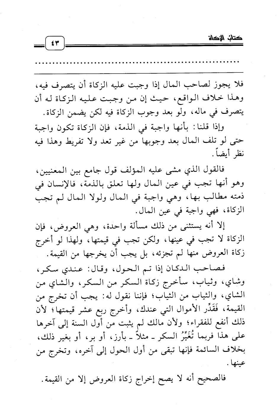 فصاحب الدكان إذا تم الحول، وقال: عندي سكر، وشاي، وثياب، سأخرج زكاة السكر من السكر، والشاي من الشاي، والثياب من الثياب؛ فإننا نقول له: يجب أن تخرج من القيمة، فَقَدِّر الأموال التي عندك، وأخرج ربع عشر قيمتها؛ لأن ذلك أنفع للفقراء؛ ولأن مالك لم يثبت من أول السنة إلى آخرها على هذا فربما تُغَيِّرُ السكر ـ مثلاً ـ بأرز، أو بر، أو بغير ذلك، بخلاف السائمة فإنها تبقى من أول الحول إلى آخره، وتخرج من عينها.