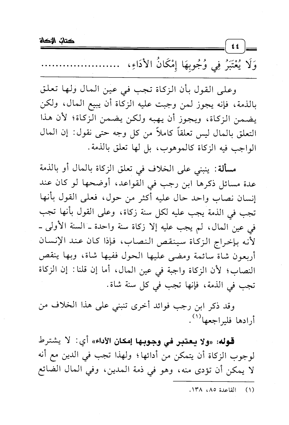 مسألة: ينبني على الخلاف في تعلق الزكاة بالمال أو بالذمة عدة مسائل ذكرها ابن رجب في القواعد، أوضحها لو كان عند إنسان نصاب واحد حال عليه أكثر من حول، فعلى القول بأنها تجب في الذمة يجب عليه لكل سنة زكاة، وعلى القول بأنها تجب في عين المال، لم يجب عليه إلا زكاة سنة واحدة ـ السنة الأولى ـ لأنه بإخراج الزكاة سينقص النصاب، فإذا كان عند الإنسان أربعون شاة سائمة ومضى عليها الحول ففيها شاة، وبها ينقص النصاب؛ لأن الزكاة واجبة في عين المال، أما إن قلنا: إن الزكاة تجب في الذمة، فإنها تجب في كل سنة شاة.
