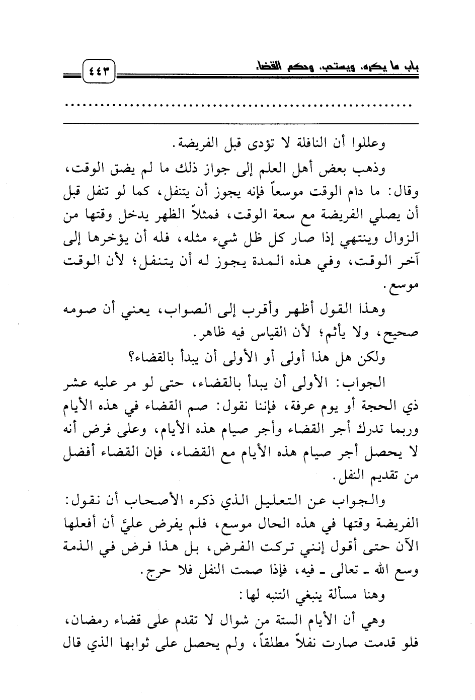 والجواب عن التعليل الذي ذكره الأصحاب أن نقول: الفريضة وقتها في هذه الحال موسع، فلم يفرض عليَّ أن أفعلها الآن حتى أقول إنني تركت الفرض، بل هذا فرض في الذمة وسع الله ـ تعالى ـ فيه، فإذا صمت النفل فلا حرج.