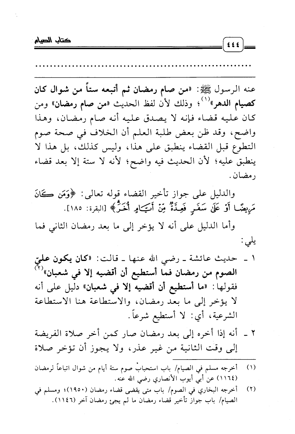 1 ـ حديث عائشة ـ رضي الله عنها ـ قالت: «كان يكون عليّ الصوم من رمضان فما أستطيع أن أقضيه إلا في شعبان» (¬2) فقولها: «ما أستطيع أن أقضيه إلا في شعبان» دليل على أنه لا يؤخر إلى ما بعد رمضان، والاستطاعة هنا الاستطاعة الشرعية، أي: لا أستطيع شرعاً.