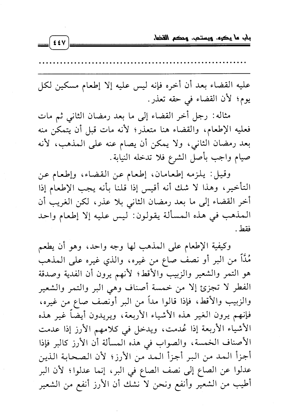 مثاله: رجل أخر القضاء إلى ما بعد رمضان الثاني ثم مات فعليه الإطعام، والقضاء هنا متعذر؛ لأنه مات قبل أن يتمكن منه بعد رمضان الثاني، ولا يمكن أن يصام عنه على المذهب، لأنه صيام واجب بأصل الشرع فلا تدخله النيابة.