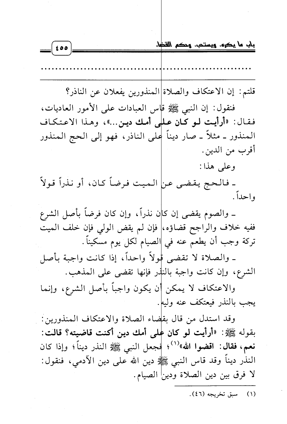 فنقول: إن النبي صلّى الله عليه وسلّم قاس العبادات على الأمور العاديات، فقال: «أرأيت لو كان على أمك دين ... »، وهذا الاعتكاف المنذور ـ مثلاً ـ صار ديناً على الناذر، فهو إلى الحج المنذور أقرب من الدين.
