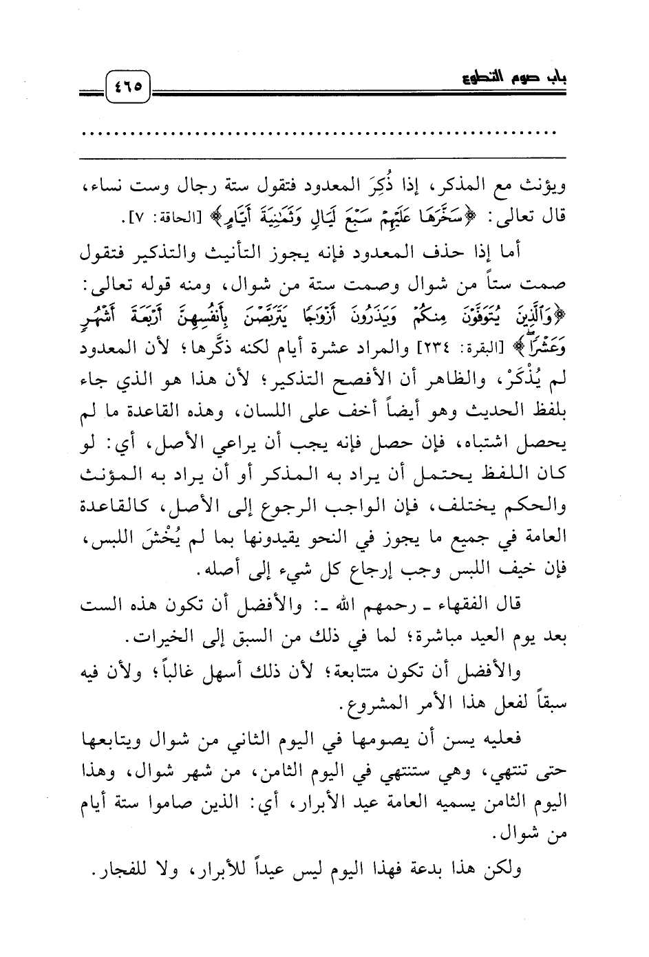 أما إذا حذف المعدود فإنه يجوز التأنيث والتذكير فتقول صمت ستاً من شوال وصمت ستة من شوال، ومنه قوله تعالى: {وَالَّذِينَ يُتَوَفَّوْنَ مِنْكُمْ وَيَذَرُونَ أَزْوَاجًا يَتَرَبَّصْنَ بِأَنْفُسِهِنَّ أَرْبَعَةَ أَشْهُرٍ وَعَشْرًا} [البقرة: 234] والمراد عشرة أيام لكنه ذكَّرها؛ لأن المعدود لم يُذْكَرْ، والظاهر أن الأفصح التذكير؛ لأن هذا هو الذي جاء بلفظ الحديث وهو أيضاً أخف على اللسان، وهذه القاعدة ما لم يحصل اشتباه، فإن حصل فإنه يجب أن يراعي الأصل، أي: لو كان اللفظ يحتمل أن يراد به المذكر أو أن يراد به المؤنث والحكم يختلف، فإن الواجب الرجوع إلى الأصل، كالقاعدة العامة في جميع ما يجوز في النحو يقيدونها بما لم يُخْشَ اللبس، فإن خيف اللبس وجب إرجاع كل شيء إلى أصله.