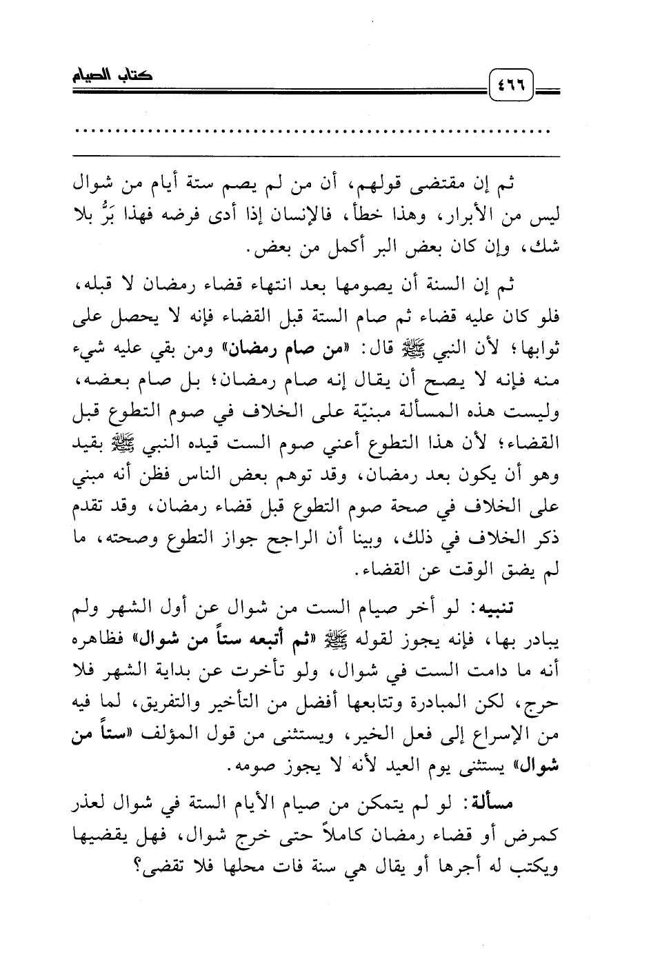 تنبيه: لو أخر صيام الست من شوال عن أول الشهر ولم يبادر بها، فإنه يجوز لقوله صلّى الله عليه وسلّم «ثم أتبعه ستاً من شوال» فظاهره أنه ما دامت الست في شوال، ولو تأخرت عن بداية الشهر فلا حرج، لكن المبادرة وتتابعها أفضل من التأخير والتفريق، لما فيه من الإسراع إلى فعل الخير، ويستثنى من قول المؤلف «ستاً من شوال» يستثنى يوم العيد لأنه لا يجوز صومه.