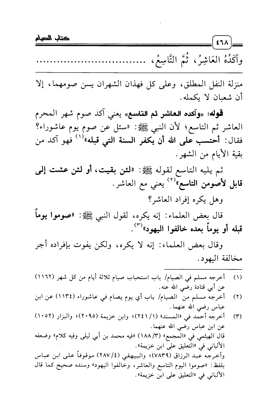 قوله: «وآكده العاشر ثم التاسع» يعني آكد صوم شهر المحرم العاشر ثم التاسع؛ لأن النبي صلّى الله عليه وسلّم: «سئل عن صوم يوم عاشوراء؟ فقال: أحتسب على الله أن يكفر السنة التي قبله» (¬1) فهو آكد من بقية الأيام من الشهر.
