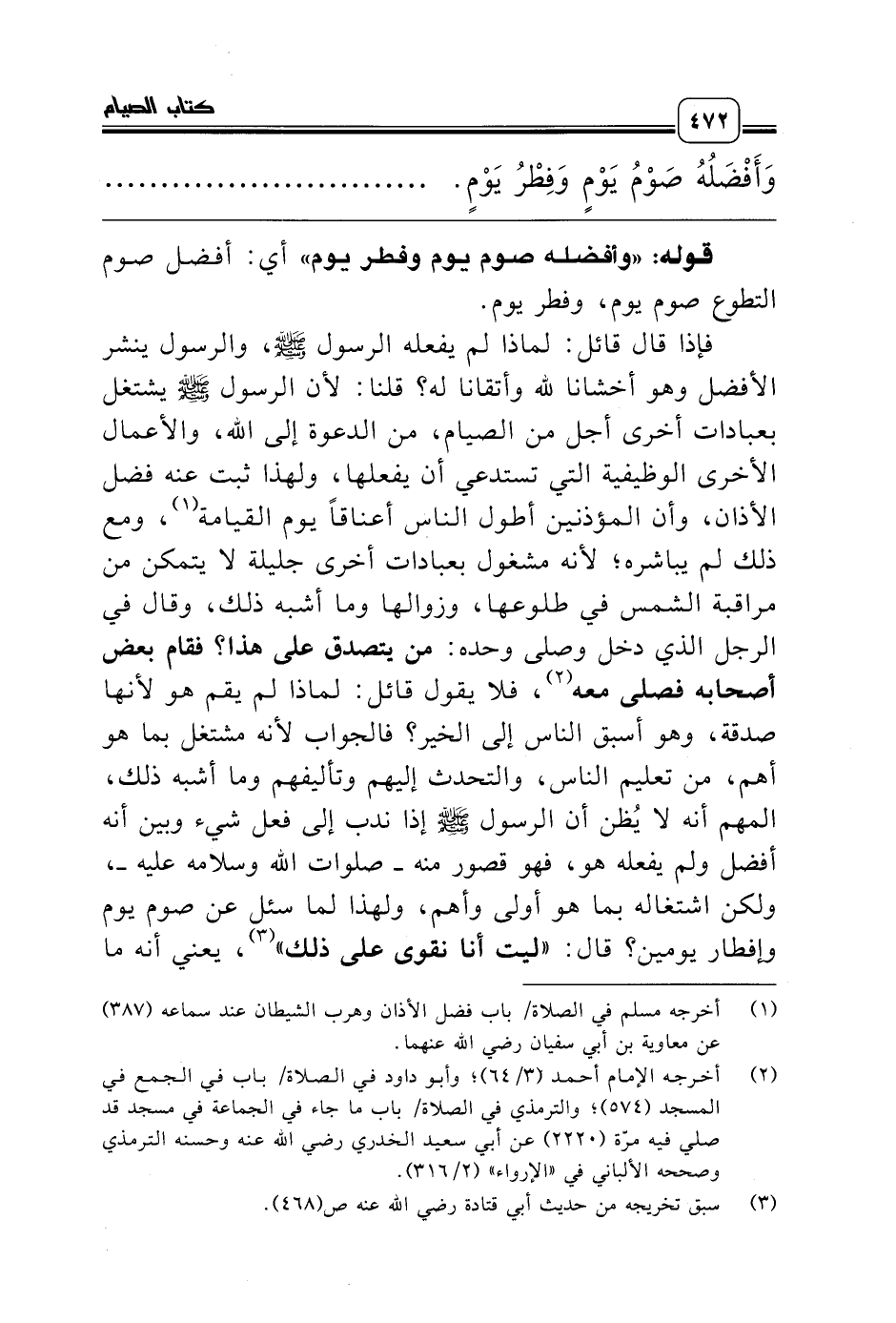 فإذا قال قائل: لماذا لم يفعله الرسول صلّى الله عليه وسلّم، والرسول ينشر الأفضل وهو أخشانا لله وأتقانا له؟ قلنا: لأن الرسول صلّى الله عليه وسلّم يشتغل بعبادات أخرى أجل من الصيام، من الدعوة إلى الله، والأعمال الأخرى الوظيفية التي تستدعي أن يفعلها، ولهذا ثبت عنه فضل الأذان، وأن المؤذنين أطول الناس أعناقاً يوم القيامة (¬1)، ومع ذلك لم يباشره؛ لأنه مشغول بعبادات أخرى جليلة لا يتمكن من مراقبة الشمس في طلوعها، وزوالها وما أشبه ذلك، وقال في الرجل الذي دخل وصلى وحده: من يتصدق على هذا؟ فقام بعض أصحابه فصلى معه (¬2)، فلا يقول قائل: لماذا لم يقم هو لأنها صدقة، وهو أسبق الناس إلى الخير؟ فالجواب لأنه مشتغل بما هو أهم، من تعليم الناس، والتحدث إليهم وتأليفهم وما أشبه ذلك، المهم أنه لا يُظن أن الرسول صلّى الله عليه وسلّم إذا ندب إلى فعل شيء وبين أنه أفضل ولم يفعله هو، فهو قصور منه ـ صلوات الله وسلامه عليه ـ، ولكن اشتغاله بما هو أولى وأهم، ولهذا لما سئل عن صوم يوم وإفطار يومين؟ قال: «ليت أنا نقوى على ذلك» (¬3)، يعني أنه ما