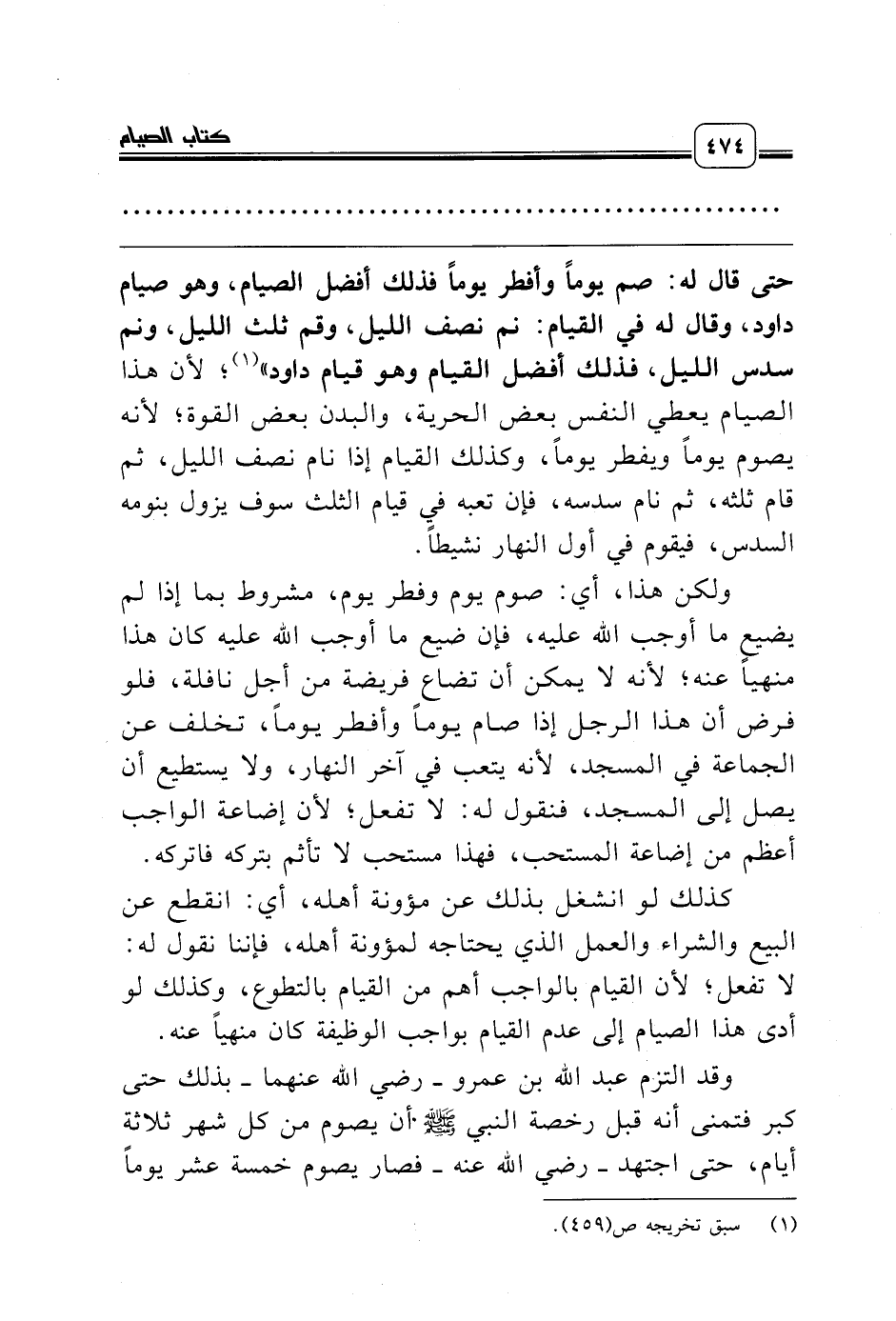 ولكن هذا، أي: صوم يوم وفطر يوم، مشروط بما إذا لم يضيع ما أوجب الله عليه، فإن ضيع ما أوجب الله عليه كان هذا منهياً عنه؛ لأنه لا يمكن أن تضاع فريضة من أجل نافلة، فلو فرض أن هذا الرجل إذا صام يوماً وأفطر يوماً، تخلف عن الجماعة في المسجد، لأنه يتعب في آخر النهار، ولا يستطيع أن يصل إلى المسجد، فنقول له: لا تفعل؛ لأن إضاعة الواجب أعظم من إضاعة المستحب، فهذا مستحب لا تأثم بتركه فاتركه.