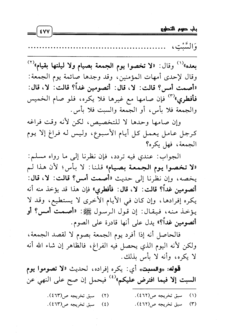 قوله: «والسبت» أي: يكره إفراده، لحديث «لا تصوموا يوم السبت إلا فيما افترض عليكم» (¬4) فيحمل إن صح على النهي عن