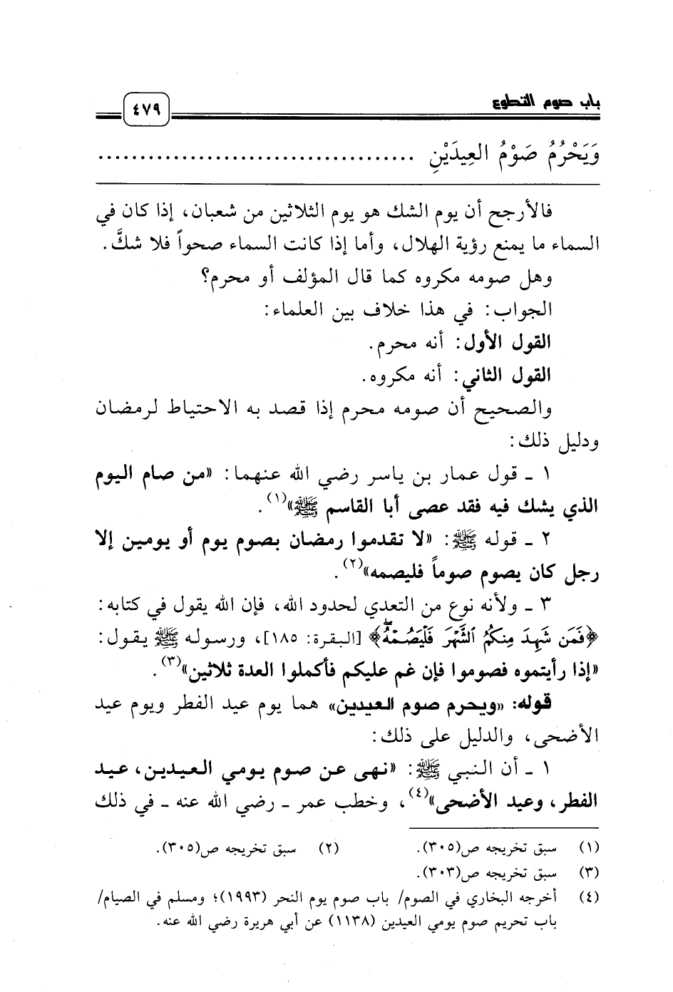 1 ـ أن النبي صلّى الله عليه وسلّم: «نهى عن صوم يومي العيدين، عيد الفطر، وعيد الأضحى» (¬4)، وخطب عمر ـ رضي الله عنه ـ في ذلك