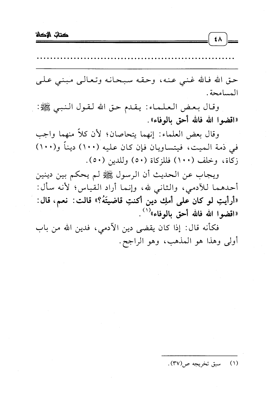 ويجاب عن الحديث أن الرسول صلّى الله عليه وسلّم لم يحكم بين دينين أحدهما للآدمي، والثاني لله، وإنما أراد القياس؛ لأنه سأل: «أرأيتِ لو كان على أمكِ دين أكنتِ قاضيتَهُ؟» قالت: نعم، قال: «اقضوا الله فالله أحق بالوفاء» (¬1).