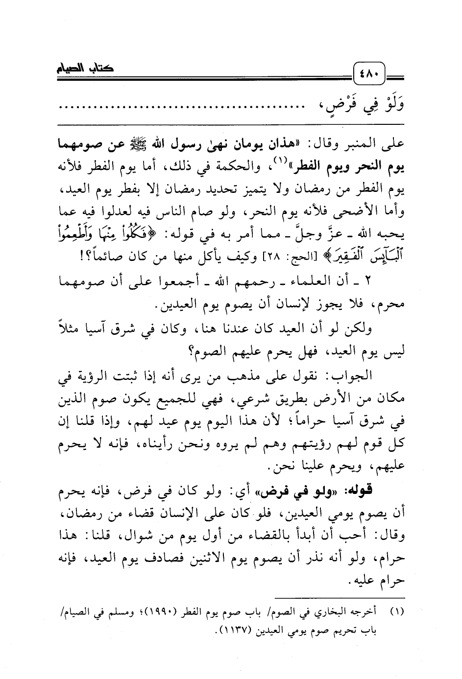 قوله: «ولو في فرض» أي: ولو كان في فرض، فإنه يحرم أن يصوم يومي العيدين، فلو كان على الإنسان قضاء من رمضان، وقال: أحب أن أبدأ بالقضاء من أول يوم من شوال، قلنا: هذا حرام، ولو أنه نذر أن يصوم يوم الاثنين فصادف يوم العيد، فإنه حرام عليه.