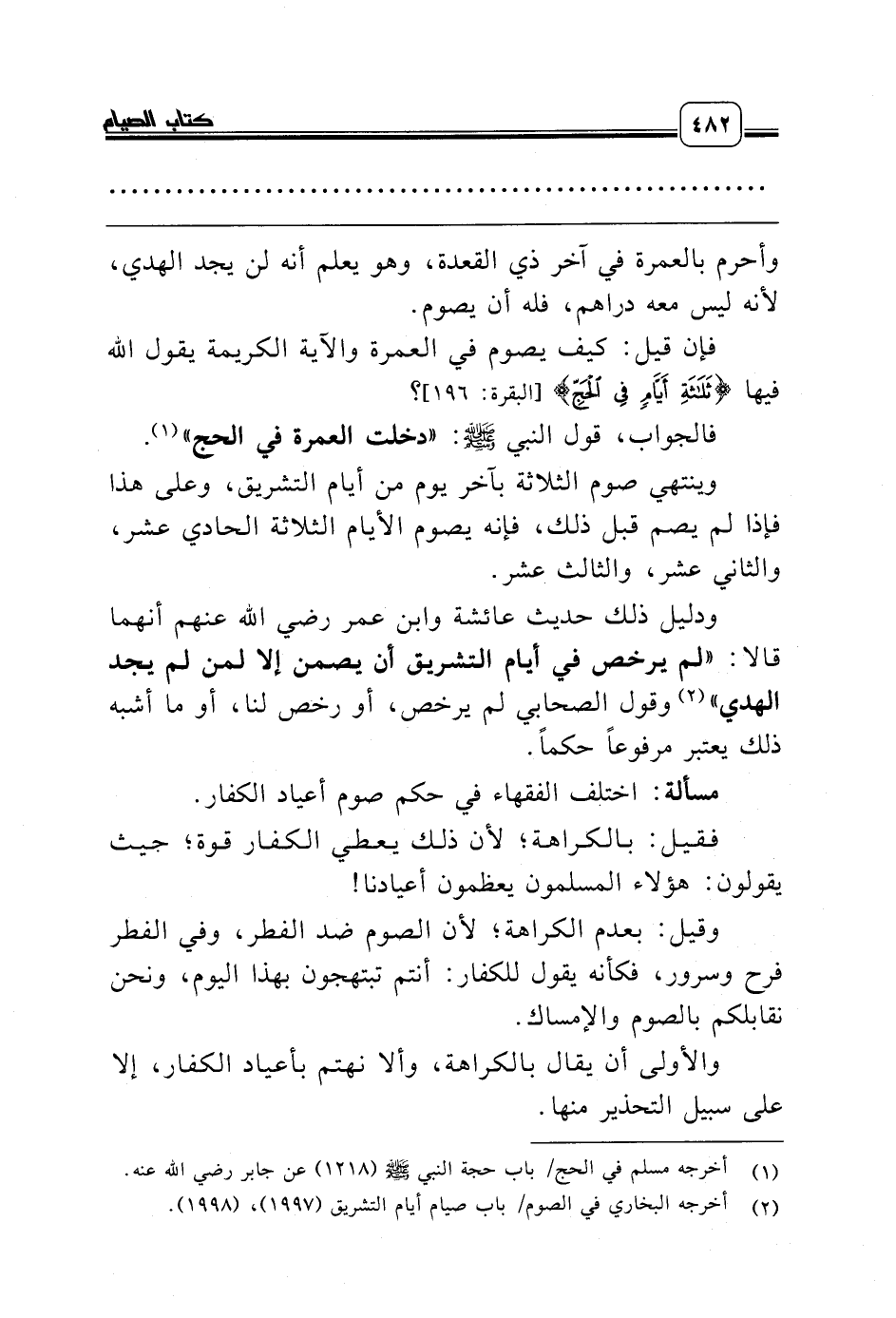 ودليل ذلك حديث عائشة وابن عمر رضي الله عنهم أنهما قالا: «لم يرخص في أيام التشريق أن يصمن إلا لمن لم يجد الهدي» (¬2) وقول الصحابي لم يرخص، أو رخص لنا، أو ما أشبه ذلك يعتبر مرفوعاً حكماً.