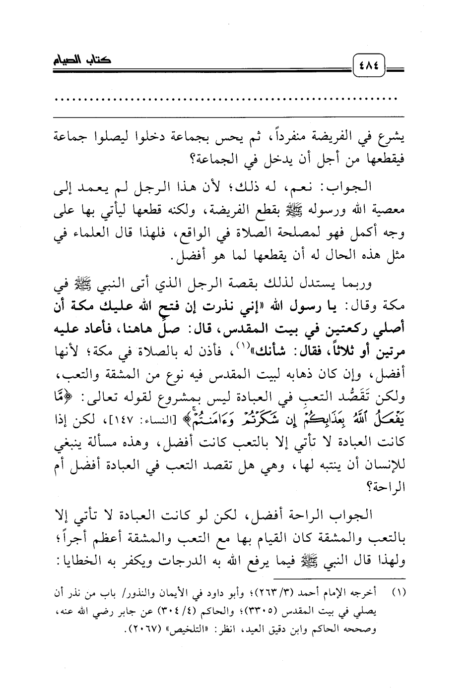 (¬1) أخرجه الإمام أحمد (3/ 263)؛ وأبو داود في الأيمان والنذور/ باب من نذر أن يصلي في بيت المقدس (3305)؛ والحاكم (4/ 304) عن جابر رضي الله عنه، وصححه الحاكم وابن دقيق العيد، انظر: «التلخيص» (2067).