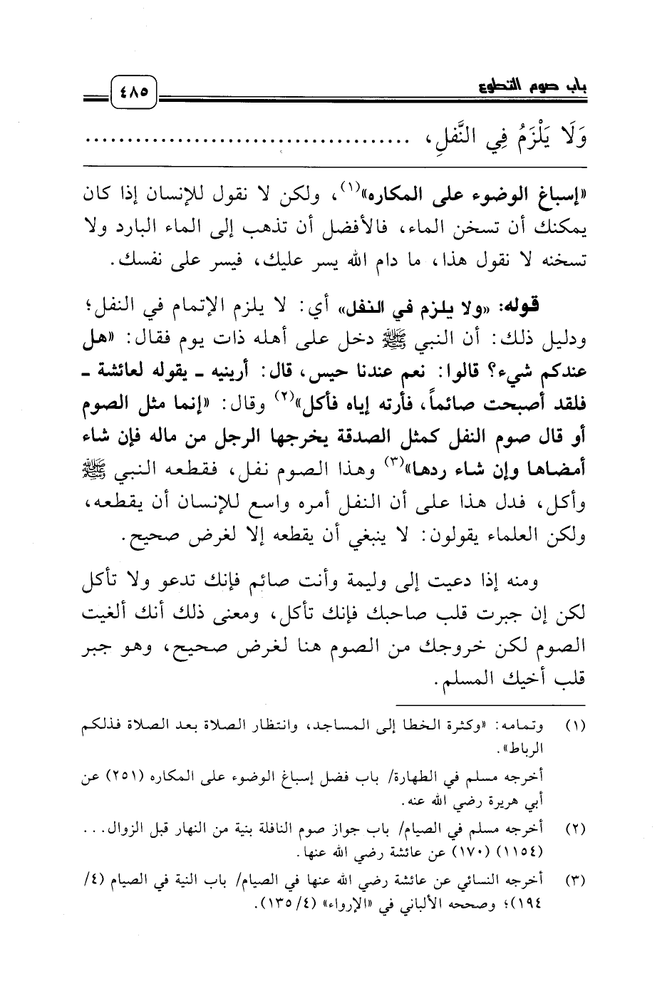 قوله: «ولا يلزم في النفل» أي: لا يلزم الإتمام في النفل؛ ودليل ذلك: أن النبي صلّى الله عليه وسلّم دخل على أهله ذات يوم فقال: «هل عندكم شيء؟ قالوا: نعم عندنا حيس، قال: أرينيه ـ يقوله لعائشة ـ فلقد أصبحت صائماً، فأرته إياه فأكل» (¬2) وقال: «إنما مثل الصوم أو قال صوم النفل كمثل الصدقة يخرجها الرجل من ماله فإن شاء أمضاها وإن شاء ردها» (¬3) وهذا الصوم نفل، فقطعه النبي صلّى الله عليه وسلّم وأكل، فدل هذا على أن النفل أمره واسع للإنسان أن يقطعه، ولكن العلماء يقولون: لا ينبغي أن يقطعه إلا لغرض صحيح.