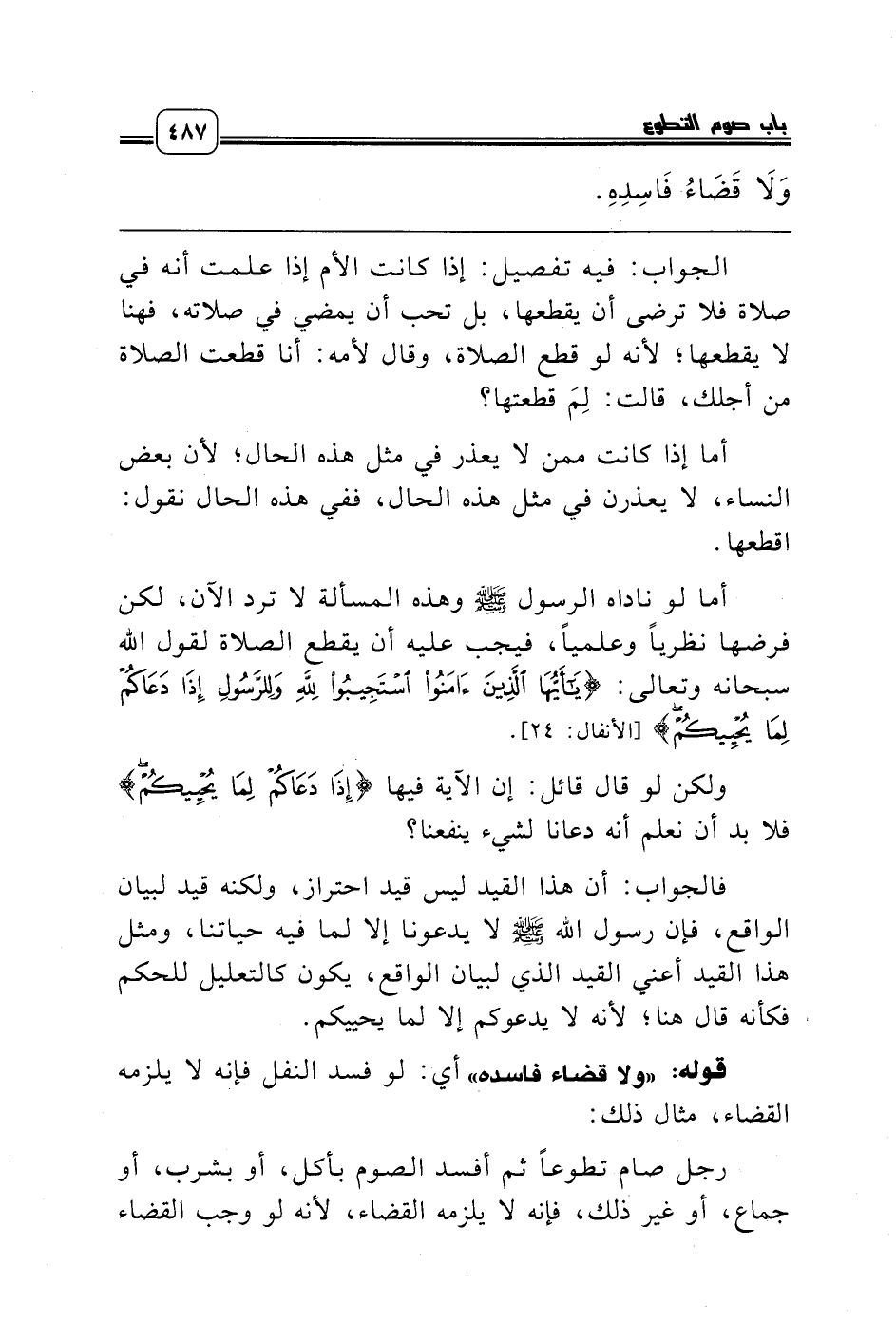 أما لو ناداه الرسول صلّى الله عليه وسلّم وهذه المسألة لا ترد الآن، لكن فرضها نظرياً وعلمياً، فيجب عليه أن يقطع الصلاة لقول الله سبحانه وتعالى: {يَاأَيُّهَا الَّذِينَ آمَنُوا اسْتَجِيبُوا لِلَّهِ وَلِلرَّسُولِ إِذَا دَعَاكُمْ لِمَا يُحْيِيكُمْ} [الأنفال: 24].