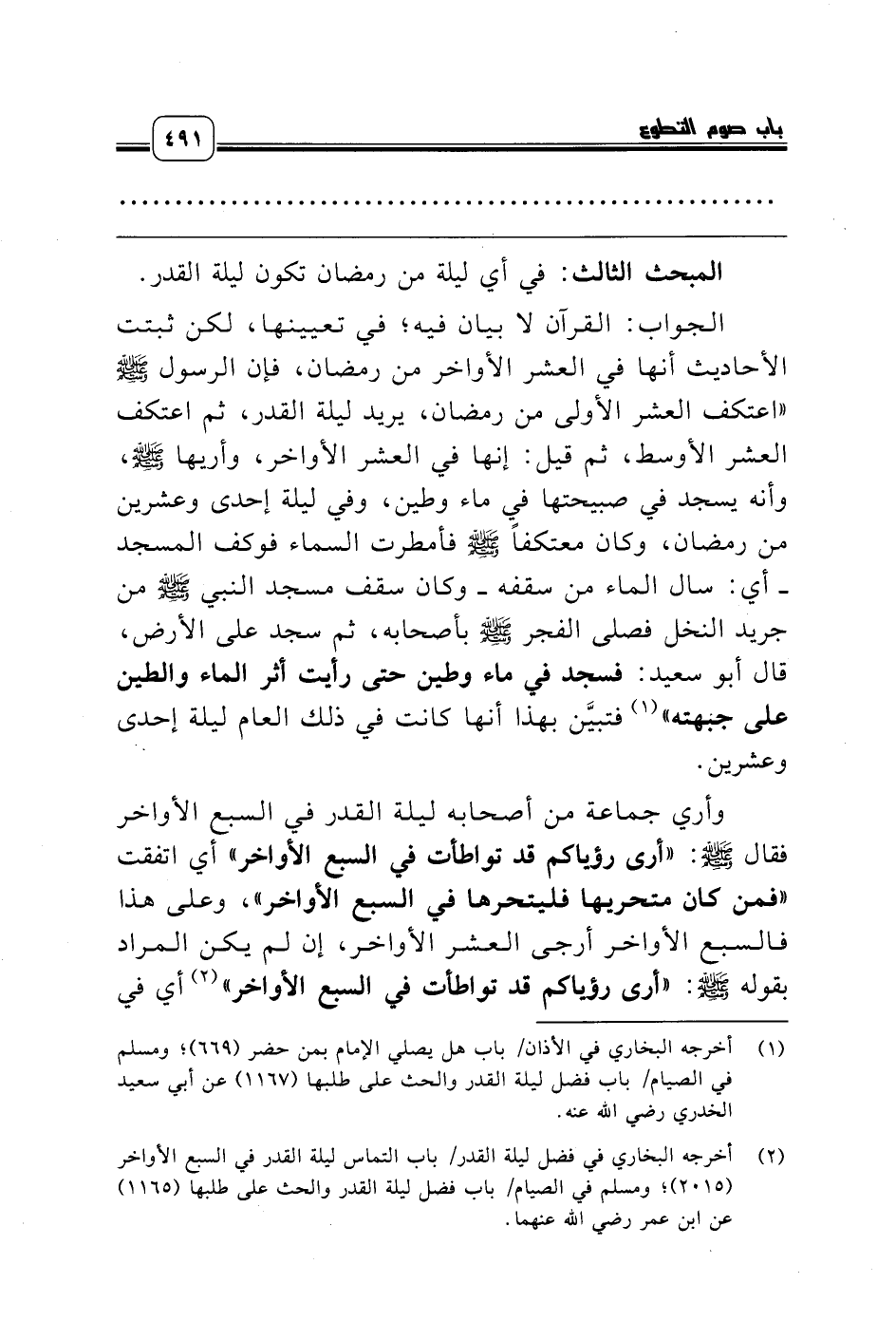(¬2) أخرجه البخاري في فضل ليلة القدر/ باب التماس ليلة القدر في السبع الأواخر (2015)؛ ومسلم في الصيام/ باب فضل ليلة القدر والحث على طلبها (1165) عن ابن عمر رضي الله عنهما.