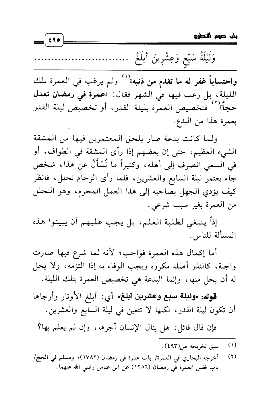 واحتساباً غفر له ما تقدم من ذنبه» (¬1) ولم يرغب في العمرة تلك الليلة، بل رغب فيها في الشهر فقال: «عمرة في رمضان تعدل حجاً» (¬2) فتخصيص العمرة بليلة القدر، أو تخصيص ليلة القدر بعمرة هذا من البدع.