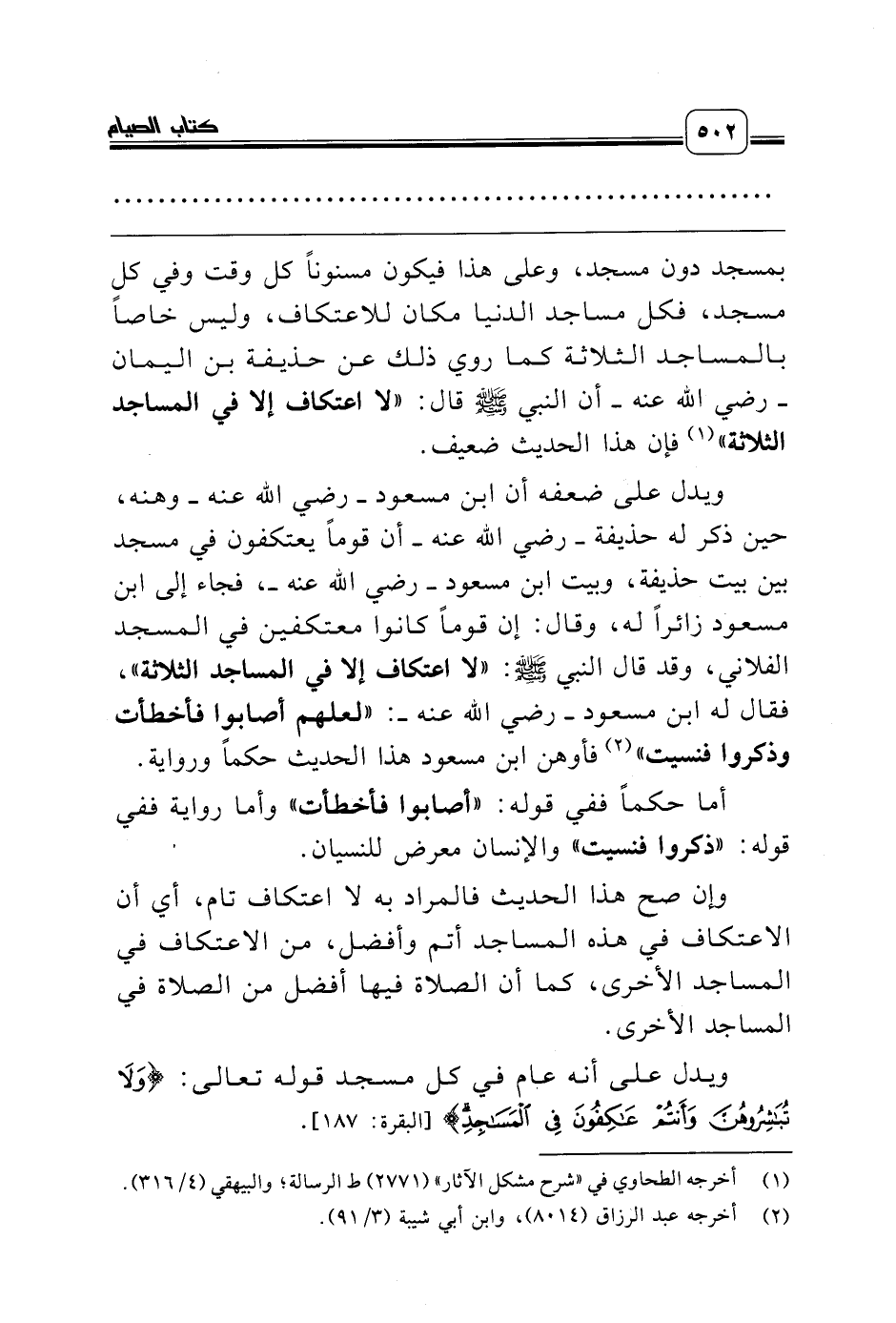 بمسجد دون مسجد، وعلى هذا فيكون مسنوناً كل وقت وفي كل مسجد، فكل مساجد الدنيا مكان للاعتكاف، وليس خاصاً بالمساجد الثلاثة كما روي ذلك عن حذيفة بن اليمان ـ رضي الله عنه ـ أن النبي صلّى الله عليه وسلّم قال: «لا اعتكاف إلا في المساجد الثلاثة» (¬1) فإن هذا الحديث ضعيف.