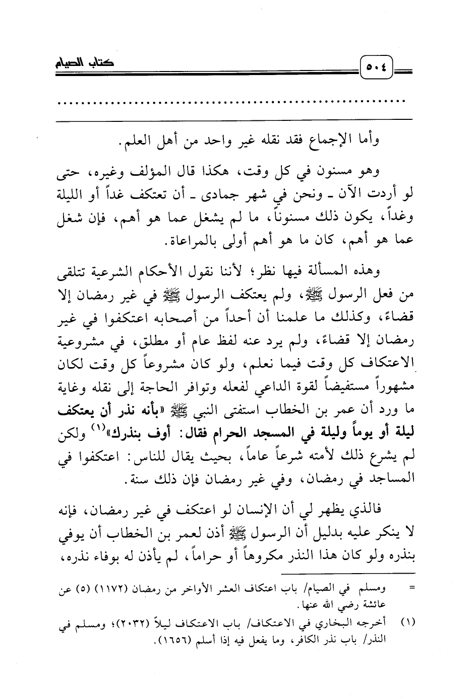 وهذه المسألة فيها نظر؛ لأننا نقول الأحكام الشرعية تتلقى من فعل الرسول صلّى الله عليه وسلّم، ولم يعتكف الرسول صلّى الله عليه وسلّم في غير رمضان إلا قضاءً، وكذلك ما علمنا أن أحداً من أصحابه اعتكفوا في غير رمضان إلا قضاءً، ولم يرد عنه لفظ عام أو مطلق، في مشروعية الاعتكاف كل وقت فيما نعلم، ولو كان مشروعاً كل وقت لكان مشهوراً مستفيضاً لقوة الداعي لفعله وتوافر الحاجة إلى نقله وغاية ما ورد أن عمر بن الخطاب استفتى النبي صلّى الله عليه وسلّم «بأنه نذر أن يعتكف ليلة أو يوماً وليلة في المسجد الحرام فقال: أوف بنذرك» (¬1) ولكن لم يشرع ذلك لأمته شرعاً عاماً، بحيث يقال للناس: اعتكفوا في المساجد في رمضان، وفي غير رمضان فإن ذلك سنة.