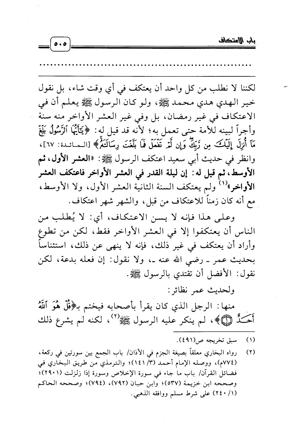 لكننا لا نطلب من كل واحد أن يعتكف في أي وقت شاء، بل نقول خير الهدي هدي محمد صلّى الله عليه وسلّم، ولو كان الرسول صلّى الله عليه وسلّم يعلم أن في الاعتكاف في غير رمضان، بل وفي غير العشر الأواخر منه سنة وأجراً لبينه للأمة حتى تعمل به؛ لأنه قد قيل له: {يَاأَيُّهَا الرَّسُولُ بَلِّغْ مَا أُنْزِلَ إِلَيْكَ مِنْ رَبِّكَ وَإِنْ لَمْ تَفْعَلْ فَمَا بَلَّغْتَ رِسَالَتَهُ} [المائدة: 67]، وانظر في حديث أبي سعيد اعتكف الرسول صلّى الله عليه وسلّم: «العشر الأول، ثم الأوسط، ثم قيل له: إن ليلة القدر في العشر الأواخر فاعتكف العشر الأواخر» (¬1) ولم يعتكف السنة الثانية العشر الأول، ولا الأوسط، مع أنه كان زمناً للاعتكاف من قبل، والشهر شهر اعتكاف.