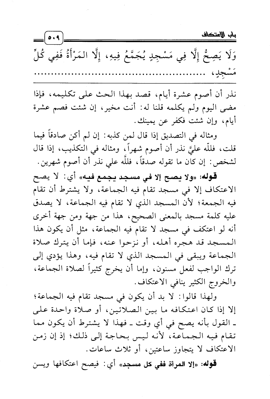 قوله: «ولا يصح إلا في مسجد يجمع فيه» أي: لا يصح الاعتكاف إلا في مسجد تقام فيه الجماعة، ولا يشترط أن تقام فيه الجمعة؛ لأن المسجد الذي لا تقام فيه الجماعة، لا يصدق عليه كلمة مسجد بالمعنى الصحيح، هذا من جهة ومن جهة أخرى أنه لو اعتكف في مسجد لا تقام فيه الجماعة، مثل أن يكون هذا المسجد قد هجره أهله، أو نزحوا عنه، فإما أن يترك صلاة الجماعة ويبقى في المسجد الذي لا تقام فيه، وهذا يؤدي إلى ترك الواجب لفعل مسنون، وإما أن يخرج كثيراً لصلاة الجماعة، والخروج الكثير ينافي الاعتكاف.
